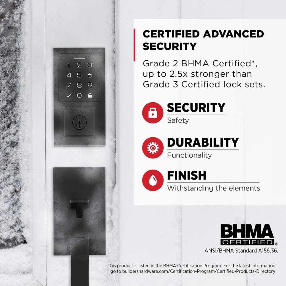 Add a level of style and security to your home with the SmartCode 270 touchpad keyless entry electronic deadbolt. Designed with a sleek contemporary style to complement your home's interior, you can secure your home and never have to worry about keys. To gain entry, simply enter your personalized code, while locking is as easy as the touch of a button. SmartCode is easy to install, program and use and utilizes 4 AA batteries. It also features SmartKey re-key technology as the back-up keyway. The deadbolt is operated by electronic touchpad and key outside and turn-piece inside. The crisp, clean appearance of the Matte Black finish reinforces the deadbolt's modern design. Highlights Convenient keyless entry: touchpad entry makes coming and going secure and simple, easily lock and unlock your door without having to take out your keys Certified advanced security: security, durability and finish are grade 2 BHMA certified, which is up to 2.5x stronger than grade 3 BHMA certified lock sets Auto-lock: enjoy security and peace of mind knowing your door can lock itself, customize it to automatically lock every 30 sec, 1 min, 3 min, 5 min or 10 min 12-month battery life: battery lasts at least 12 months, giving you more time in between battery replacements. uses 4x AA alkaline batteries (batteries not included) Easy code management: customize up to 50 user codes, 10 one-time user codes and 1 programming code that lets you edit or delete user codes whenever you need to Easy install and BILT app: installs with just a screwdriver, BILT 3D interactive instructions provide voice, text and animation guidance for an easy installation Intrusion alert: after 3 consecutive incorrect code entries, the lock sounds an alarm and disables the keypad for 1 min to prevent anyone from tampering with it Vacation mode: activate vacation mode to temporarily disable the keypad, and feel safe knowing no one can operate your door lock when you’re out of town Easy low light code entry: bright LED lights illuminate the touchpad so you can easily enter your user code at night, Simply tap the touchpad to turn on the lights Smartcode deadbolts come with BILT 3D interactive app instructions with voice, text and animation guidance for the easiest installation experience Smartcode deadbolts offer an optional programming code feature for improved access code management where a programming code is required to add or delete user codes Lifetime limited mechanical and finish warranties 1-year limited electronics warranty Deadbolt offers UL certified 20-minute fire rating Smartcode deadbolts are easy to install, program to use and operates on 4 Amper batteries with 12-month battery life (batteries not included) Easily remove the interior cover in seconds to access the batteries or programming button no screws to remove Small interior cover form factor for improved aesthetic 3 incorrect code attempts trigger an audible alarm and 60-second lockout for increased security Audible beep and visual flash when batteries are low power