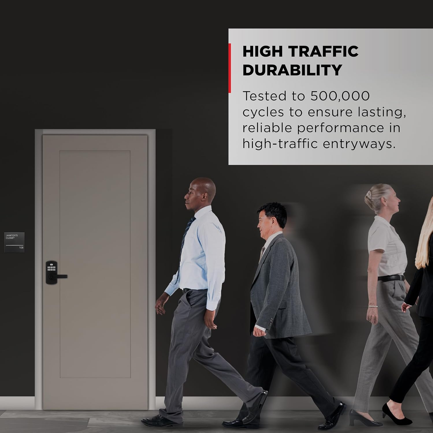 CONVENIENT KEYLESS ENTRY: Keypad entry makes coming and going secure and simple. Easily lock and unlock your door without having to take out your keys 3-YEAR BATTERY LIFE: Battery lasts at least 3 years, giving you more time in between battery replacements. Uses 1x 9V battery, battery included HIGH TRAFFIC DURABILITY: Lock tested to 500,000 cycles to ensure lasting, reliable performance in high-traffic entryways like bathrooms, storage sheds, and small businesses EASY CODE MANAGEMENT: Customize up to 30 user codes, 1 one-time user code and 1 programming code that lets you edit or delete user codes whenever you need to 3 LOCK MODES: Easily switch between Auto-Lock and Passage modes with the turnpiece. Disable the turnpiece to stay in Auto-Lock mode — ideal for public restrooms The Kwikset SmartCode 955 Pembroke Light Commercial Electronic Lever offers convenient keyless entry, making coming and going secure and simple. With a 3-year battery life and a tested durability of 500,000 cycles, it delivers reliable performance in high-traffic entryways. Choose from three lock modes to suit your needs: Auto-Lock requires a key or code for entry, Passage allows continuous access, and disabling the turnpiece keeps the lever in Auto-Lock mode. It’s a simple solution for secure and versatile access control.