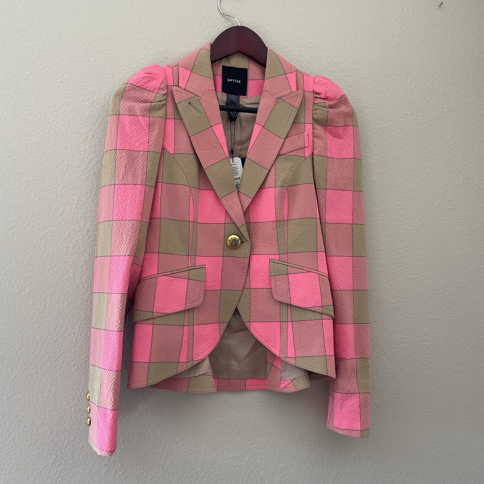 Smythe Pouf Sleeve One Button Blazer in pink check Size 2 See photos for measurements New with tags! Puffed sleeves, single button, lightweight seersucker fabric, bright pink and tan check print, button cuffs, comes with extra button, two stitched close pockets, tailored fit, feminine luxury designer Make me an offer! ❤️ Smoke free home! 🏡