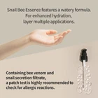 [BRAND PHILOSOPHY] At our brand, we believe in 'Clean Beauty' that relies on nature-derived ingredients. We go the extra mile by testing and implementing materials and structures that are easily separable and recyclable, starting from the product planning stage. Join us in our mission to make a positive impact on the environment with our Greenminded practices. [Snail Secretion Filtrate] Snail Bee High Content Essence, introduced in 2012, is the original skincare product featuring snail secretion filtrate. This ingredient is known for its excellent moisturizing and soothing effects. We ensure no snails are harmed during the extraction process, as we carefully raise our snails with the utmost care. [Additional Ingredients & Functions] The Snail Bee High Content Essence is a lightweight, multitasking skincare product that combines niacinamide, six-level peptides, and adenosine. It helps hydrate and soothe your skin. [Instruction & How to Use] Snail Bee High Content Essence contains snail secretion filtrate and bee venom, please try a patch test prior to use to check allergic reactions. Our product does not contain artificial fragrances. You can notice the subtle scent, which is from the propolis. The texture of the essence is light & watery. If you want longlasting hydration, it is recommended to create layers by multiple usage.