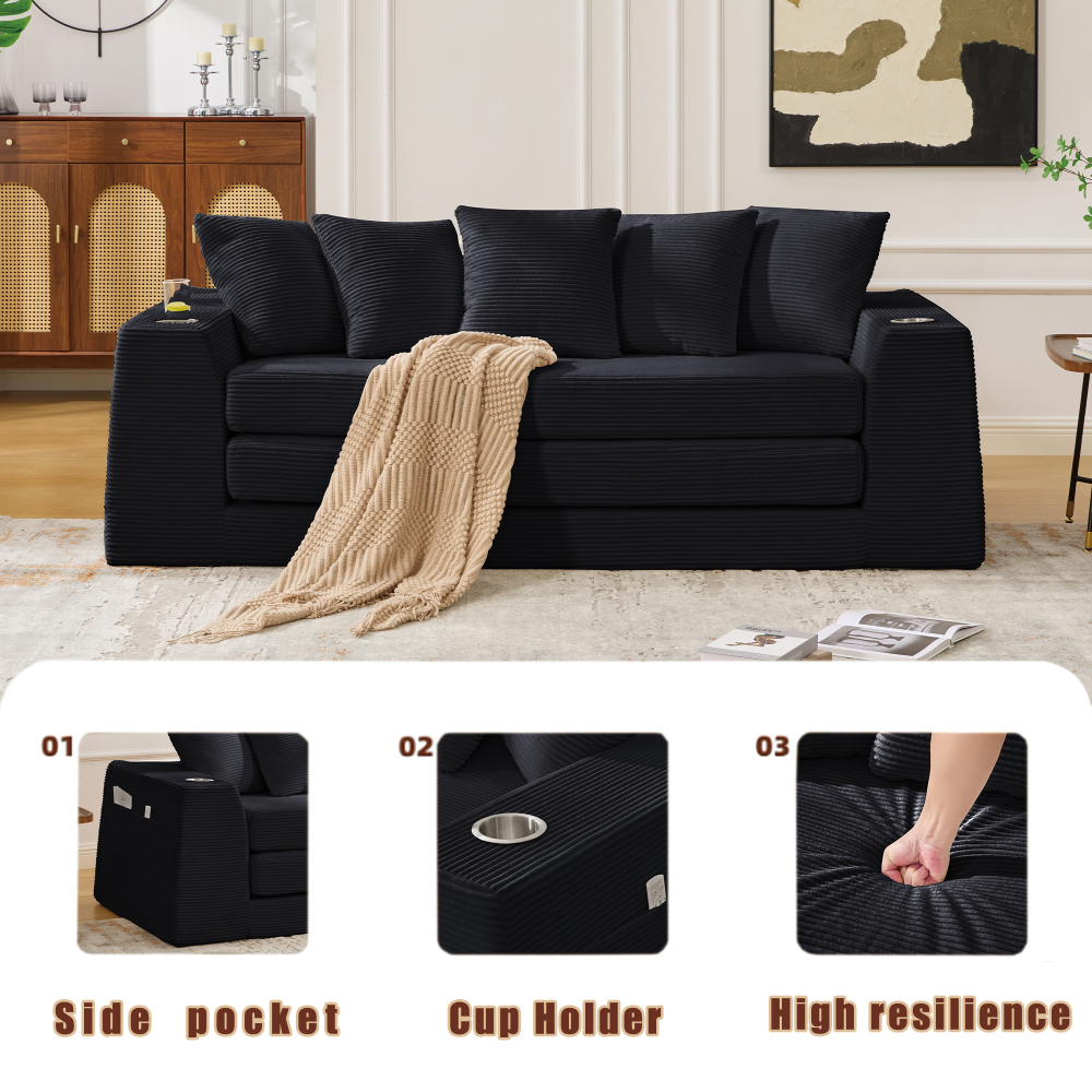[NEW ARRIVED] [VIDEO PROVIDED] 82.25" 2-in-1 Convertible Sofa Bed, Corduroy 3-Seat Sleeper Sofa with 5 Pillows, Side Pockets, 2 Cup Holders, No Assembly (7 Colors) Introducing our NEW ARRIVED 82.25" Convertible Sofa Bed—your perfect blend of style, comfort, and versatility! [VIDEO PROVIDED] to show you every detail of this 2-in-1 masterpiece. Available in 7 trendy colors (Black/Light Gray/Dark Gray/Orange/Blue/Green/Pink), this 3-seat corduroy sofa effortlessly transforms into a full-size sleeper bed, equipped with 5 pillows, side storage pockets, and dual cup holders. Crafted with soft polyester corduroy and high-density foam, it offers all-day comfort, requires NO assembly, and fits seamlessly into any primary living space—living room, study, guest room, RV, or even gym. A modern, practical addition to elevate your home! Common Key Specifications (All 7 Styles) Item Details Origin China Material Polyester Corduroy (Upholstery) + Foam (Filling); Pink: Upholstered + Polyester Fabric + Foam Style Modern Seat Count 3 Seat Convertible Function 2-in-1 (Sofa → Full-Size Sleeper Bed); One-Pull Operation Special Features 5 Pillows Included, 2 Side Storage Pockets, 2 Cup Holders, No Assembly, Square Arms, Pillow Back Sofa Dimensions (Assembled) 82.25" (L) × 38.75" (W) × 32.50" (H) Sleeper Bed Dimensions 82.5" (L) × 92.75" (W) × 22" (H) (Full Size) Assembled Weight 78.54 LBS Package Dimensions 20.87" (L) × 21.00" (W) × 38.98" (H) Package Weight 87.12 LBS Sit Feel Soft Applicable Scenes Primary Living Space, Living Room, Study, Guest Room, RV, Gym Shared Core Features (All 7 Styles) [NEW ARRIVED] 2-IN-1 Convertible Design : Effortlessly switches between a stylish 3-seat sofa and a spacious full-size sleeper bed with just one pull—simple, quick, and no extra tools needed. Perfect for daily lounging, entertaining guests, or overnight stays, adapting to all your needs. Ultra-Soft All-Day Comfort : Wrapped in premium corduroy polyester fabric (soft and skin-friendly), filled with thick high-density foam for optimal support and coziness. Comes with 5 matching pillows to enhance comfort, inviting you to sink in and relax for hours—whether reading, watching TV, or napping. NO Assembly Hassles : Say goodbye to complicated furniture assembly! Unbox all packages, gently pat each part to restore its fluffy shape, and within up to 72 hours, your sofa will be picture-perfect and ready to use—ideal for busy homeowners, renters, or anyone who hates tedious setup. Practical Storage & Cup Holders : Equipped with 2 side storage pockets on the armrests (perfect for remote controls, magazines, toys, or small essentials) and 1 cup holder on each armrest. Keep your drinks within reach and your space tidy, adding convenience to your daily life. Multi-Scene Versatility : This boneless convertible sofa bed fits seamlessly into any living scenario. Use it as a sofa in the living room, a sleeper bed in the guest room, a lounge in the RV, or even detach the mattress to use as a yoga mat in the gym. Enhances home style while boosting practicality. Modern Styling : Features square arms and a pillow back design, blending effortlessly with modern home decor. The 3-seat size offers ample seating space, while the sleek silhouette adds a contemporary touch to any primary living space. Style Options & Unique Color Details 1. Black 82.25" Convertible Sofa Bed Color: Black | Boasts a sleek, bold black corduroy finish that exudes modern elegance and versatility. It pairs perfectly with industrial, minimalist, or contemporary decor, adding depth and sophistication to your living space. The black tone is timeless, easy to match with any bedding or decor, and hides minor stains—ideal for high-traffic areas. 2. Light Gray 82.25" Convertible Sofa Bed Color: Light Gray | Features a soft, neutral light gray corduroy finish that offers a bright, airy vibe. It blends seamlessly with any decor style—modern, Scandinavian, or transitional—creating a calm and cozy atmosphere. The light gray tone is versatile, easy to clean, and perfect for brightening up your living room or guest room. 3. Dark Gray 82.25" Convertible Sofa Bed Color: Dark Gray | Showcases a rich, deep dark gray corduroy finish that balances sophistication and coziness. It complements modern, rustic, or eclectic decor, adding warmth and depth to your space. The dark gray tone is durable and easy to maintain, making it a practical choice for families or pet owners. 4. Orange 82.25" Convertible Sofa Bed Color: Orange | Adds a vibrant, cheerful pop of color to your home with its bright orange corduroy finish. Perfect for those who love bold, playful decor, it instantly elevates any living space—adding energy and warmth. The orange tone pairs well with neutral walls and decor, making it a statement piece that doesn’t overpower the room. 5. Blue 82.25" Convertible Sofa Bed Color: Blue | Features a calming, refreshing blue corduroy finish that brings a serene vibe to your living space. It complements coastal, modern, or bohemian decor, creating a relaxing retreat for lounging or sleeping. The blue tone is versatile and timeless, adding a touch of tranquility to any room. 6. Green 82.25" Convertible Sofa Bed Color: Green | Brings a touch of nature indoors with its fresh green corduroy finish. It complements bohemian, rustic, or modern decor, adding warmth and vitality to your space. The green tone is calming and unique, making it a perfect choice for creating a cozy, earthy atmosphere in your living room or study. 7. Pink 82.25" Convertible Sofa Bed Color: Pink | Boasts a soft, charming pink corduroy finish that adds a playful, cozy touch to your home. Perfect for bedrooms, guest rooms, or cozy living nooks, it creates a warm and inviting atmosphere. The pink tone is gentle and versatile, pairing well with neutral or pastel decor—ideal for anyone who loves a touch of sweetness. Our Quality Guarantee (All 7 Styles) We stand behind the quality of our NEW ARRIVED 