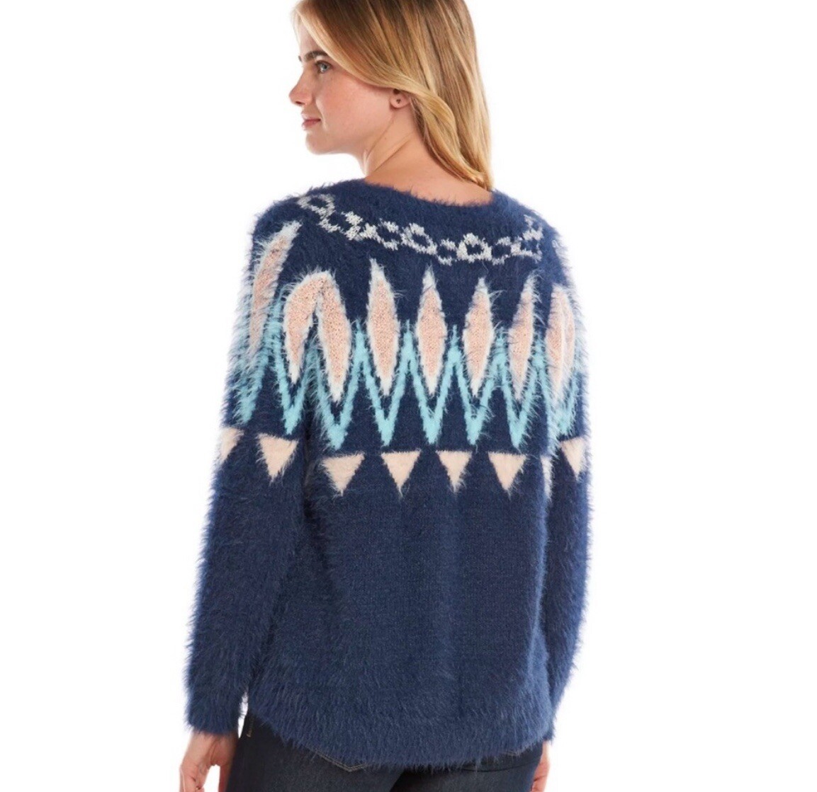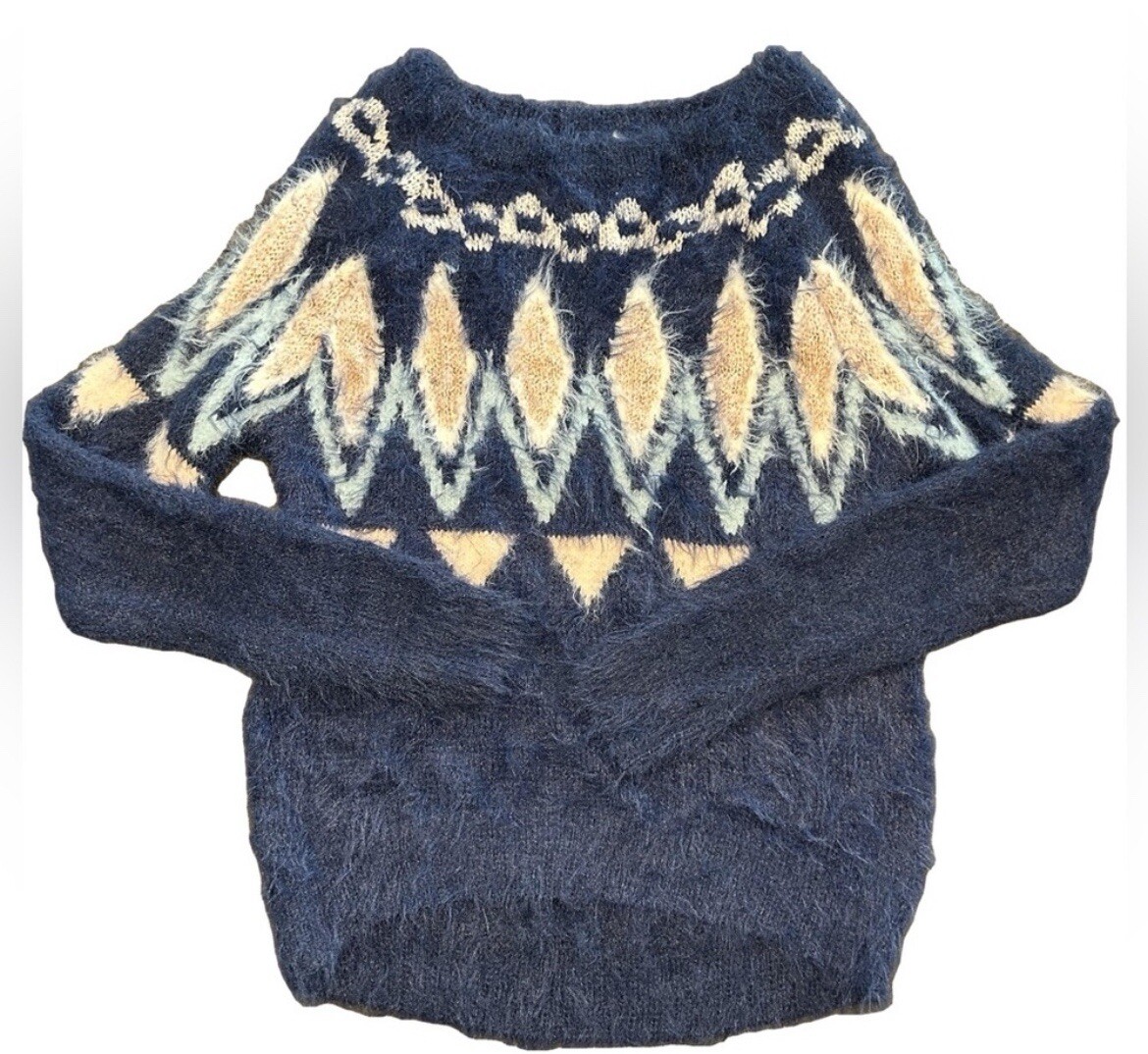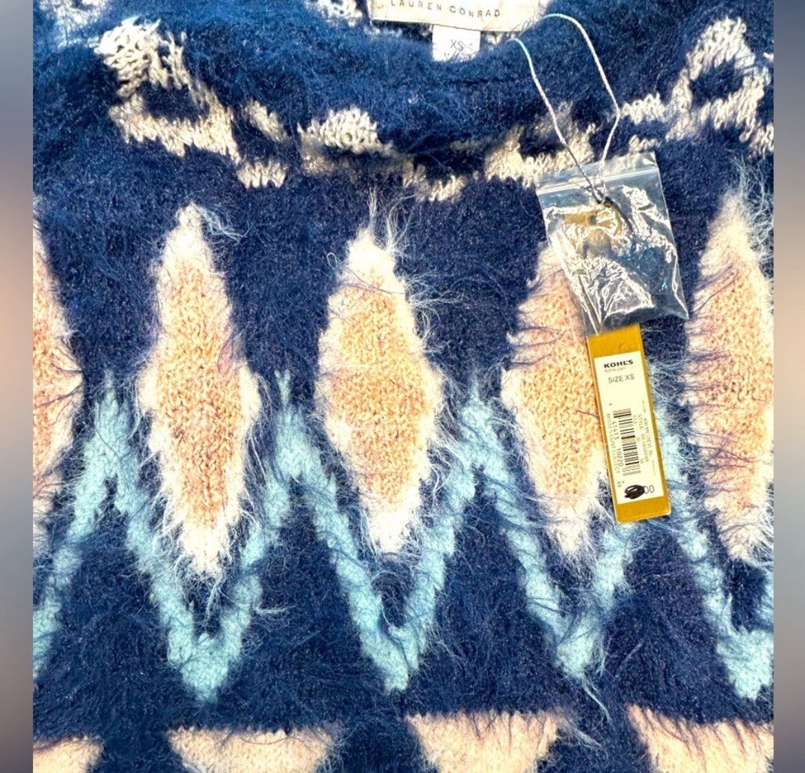 New with tags! The pictured sweater is a blue, fuzzy, boatneck sweater with a Fair Isle pattern on the upper chest by Lauren Conrad. The pattern includes white, light blue, and light pink geometric shapes. The sweater has long sleeves and a straight hem. It appears to be made of a soft, eyelash-style knit The sweater exhibits a soft and cozy aesthetic, primarily due to its eyelash knit texture and the use of pastel and neutral colors in a Fair Isle pattern. The boatneck cut and relaxed fit contribute to a comfortable and casual feel, while the geometric patterns add a touch of visual interest without being overly bold. The overall look is feminine and approachable, suitable for everyday wear in a relaxed or casual setting