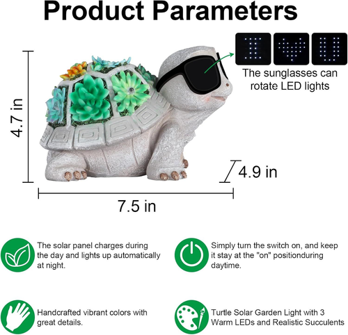 Solar Garden Statues Turtle with Succulent and LED Lights Birthday Gifts for Women Mom Grandma Solar Outdoor Decor for Patio Backyard Yard Lawn Decoration-Unique Housewarming Gifts LuxeFusion Product Description Introducing our exquisite Solar Garden Statues, the perfect addition to your outdoor space. Crafted with high-quality materials, these statues feature a charming turtle design adorned with succulent plants and LED lights. Symbolizing resilience and happiness, these statues are not only visually appealing but also weather-resistant. The eco-friendly battery is powered by solar energy, offering convenient and automatic lighting at customers love these large-size, durable solar garden statues for their thoughtful design and practicality. Whether as a decorative piece for your garden or a meaningful gift for a loved one, these statues are sure to bring joy and beauty to any outdoor setting. Enhance your garden decor with these stunning turtle garden statues that provide both aesthetic appeal and eco-friendly't miss out on this opportunity to elevate your outdoor space with our Solar Garden Statues. Experience the magic of these charming statues that combine artistry, sustainability, and convenience. Purchase now and enjoy the beauty of these solar-powered statues while contributing to a greener environment. Upgrade your garden decor with these exquisite solar garden statues today! Features 【Creative Lighting】The sunglasses on our turtle statue rotate the LED lights ‘i’, ‘❤︎’ and ‘U’, which is very creative, cool and cute and can add to your garden decor. A perfect addition to your outdoor space, this weatherproof statue exudes resilience and joy while lighting up your garden with eco-friendly solar power 【Finely Crafted】Our large-size Turtle Garden Statue is meticulously crafted to stand the test of time, embodying both style and durability. With succulent plants delicately integrated into the design, this statue captures the essence of nature, making it a unique and enchanting piece for any garden landscape 【Eco-friendly】Elevate your outdoor ambiance with the seamless integration of modern technology and nature-inspired aesthetics. This Turtle Garden Statue boasts an eco-friendly battery powered by solar energy, ensuring long-lasting illumination throughout the night while requiring minimal maintenance 【Solar Charge】Say goodbye to cumbersome wiring and batteries, as this Solar Garden Statue offers effortless solar charging and automatic lighting functionality. Simply place it in direct sunlight during the day, and watch it come to life at night, creating a captivating display that will enchant and delight both you and your guests 【Idea Gifts】Unleash the magic of our Solar Garden Statue as a thoughtful gift option for loved ones. Each purchase comes with excellent customer service, ensuring a seamless shopping experience from start to finish. Embrace the beauty of outdoor solar decor with this enchanting turtle garden statue that combines artistry, functionality, and eco-conscious design Product Details Color: Gray Brand: Pawatee Theme: Decor Material: Resin Style: Turtle Occasion: Womens Day, Mother's Day, Christmas, Birthday, Thanksgiving Product Dimensions: 7.48"D x 4.92"W x 4.72"H Recommended Uses For Product: Outdoor Mounting Type: Freestanding Included Components: Light kit inlcuded Item Weight: 1.4 Pounds Number of Items: 1 Item Weight: 1.4 pounds Manufacturer: Pawatee Country of Origin: China Item model number: 10011 🚚 Free Shipping All orders ship free and fast to your doorstep. 🔁 Easy Returns Satisfaction guaranteed. 30-day returns, no questions asked. 💬 24/7 Support Contact us anytime; we’re here to help, day or night. Brought to you by LuxeFusion – Quality you can trust.