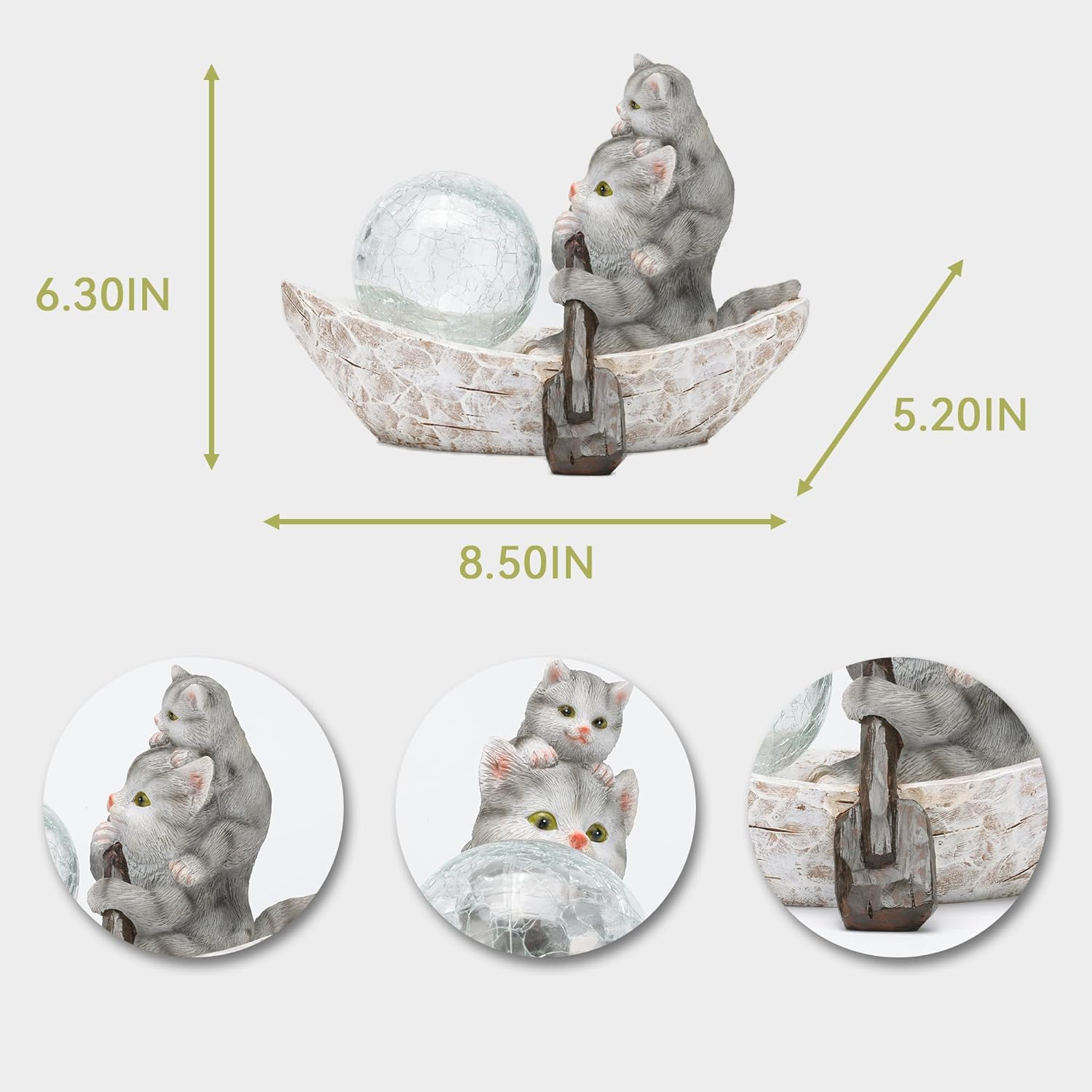 Garden Statue of Cat,Garden Decor Cat Figurine,Cats Outdoor Statue,Solar Decor for Patio,Balcony,Yard,Lawn Ornament 【Cute Outdoor Garden Decorations】This solar Cat garden decor is made of high quality resin.It looks dorable at day and the solar LED lights will Illuminate your front yard,lawn,patio,balcony or garden at night. 【Weatherproof】Rezpuao outdoor cat decor are hand-painted with UV protection coating.Each owl figurine is vividly and durable enough to withstand changing weather conditions without cracking and fading. 【Easy To Use】The patio Cat ornament which just toggle the bottom switchand leave it in the "on" position in the daytime.The solar Cat sculpture charge during the day and light up automatically at night.If the led lights don't turn on when you receive it that maybe caused by the long time shipping.Just place Cat in the sunlight for a few hours,and the problem will be fixed. 【Wonderful Garden Gift】Outdoor cat figurine is perfect for various areas,such as the garden,patios,lawns,yards,outdoor spaces,backyards,flower beds,sunrooms,and more.It's a great present for housewarming and ganrden lovers. 【Perfect Service】Rezpuao solar cat statues are professionally tested before they are shipped out from the factory.We are dedicated to provide customers with high quality products through constantly improvement.If you have any problems,please send us an email and we will give you a satisfactory answer as soon as possible. Product Description Cat Statue for Patio Lawn Ornaments Rezpuao Cat Decorations for Garden with Solar Light Cute Cat Decoration The garden cat statue of rowing designed from Scandinavian stories who has a modern look and colorful paint. Solar cat figurine acts as a wonderful addition to brighten up your garden.Size:8.50*5.2*6.30 Weatherproof & Anti-Fade Rezpuao outdoor Cat decor is made of premium resin and carefully hand-painted with UV protection coating. Each cat figurine is vividly adorned with bright color, making them unique individuals meanwhile durable enough to withstand changing weather conditions without cracking and fading. Easy To Use The patio cat ornament which just toggle the bottom switchand leave it in the "on" position in the daytime.The solar cat sculpture charge during the day and light up automatically at night.If the led lights don't turn on when you receive it that maybe caused by the long time shipping.Just place cat statue in the sunlight for a few hours,and the problem will be fixed. Wonderful Garden Gift Outdoor cat figurine is perfect for various areas, such as the garden, patios, lawns, yards, outdoor spaces,front doors, front yards,walkways, front steps, backyards,flower gardens, flower beds, sunrooms, courtyards and more. I have this cute little guy to make me smile. If you're looking for something different for your yard or as a gift for friends or relatives who appreciate amusing and useful patio, deck, and yard decorations , this is a perfect choice. Cat Statue for Patio Lawn Ornaments Rezpuao Garden Cat Statue,Solar Gnomes Figurine,Outdoor Cat Decorations This little cat is adorable. His solar light is very bright at night, especially when he's had a nice sunny day to soak up the rays through the solar panel on his side. Definitely a great addition to the patio or garden decorations. Resin Cats Figurine Solar Cat Garden Decorations,Garden Gift Parent child cat rowing, both cats are very cute.The cat is carrying an attractive glass orb in the front of the canoe. A solar panel on his side charges the lithium batteries underneath. The orb had a lovely glow as the evening rolled in. Rezpuao Garden Statue Decor Add to Cart Add to Cart Customer Reviews 5.0 out of 5 stars 1 4.6 out of 5 stars 241 4.6 out of 5 stars 241 5.0 out of 5 stars 1 4.3 out of 5 stars 9 Price $34.89 $ 34 . 89 $26.99 $ 26 . 99 $29.66 $ 29 . 66 $35.99 $ 35 . 99 $29.99 $ 29 . 99 Material Resin Resin Resin Resin Resin Style Garden & Home Decor Garden & Home Decor Garden & Home Decor Garden & Home Decor Garden & Home Decor Height 6.3 inch 5.51 inch 6.3 inch 7.48 inch 6.1 inch Waterproof √ √ √ √ √ Lighting Time 6-8h 6-8h 6-8h 6-8h 6-8h Item model number CA81343 Style Decorative Number of Items 1 Power Source Solar Powered Country of Origin China Warranty Description Two month return and exchange. Switch Style Touch Theme Love Batteries Included? Yes Usage Decoration Cartoon Character Cat Batteries Required? Yes Battery Cell Type NiMH Material Resin Type of Bulb Led Batteries 1 AA batteries required. (included) Item Weight 14.4 ounces Occasion Mother's Day Special Features Solar Powered Special Feature Solar Powered Part Number CA81343 Color Gray Shape Cat Figure Recommended Uses For Product Decoration Included Components On-Off Switch Product Dimensions 5.2"D x 8.5"W x 6.3"H Number Of Pieces 1 8.5 "h x 5.2 "h x 6.3 "h. Weight: 14.4 oz Shipping from the USA All of our products are shipped from the USA, ensuring quick delivery to your destination. Payment We offer the following payment methods: PayPal, credit card, bank transfer, and eBay's secure payment system. Free Shipping & Free Returns Shipping within the USA is FREE. Additionally, any return is absolutely free for you. Risk-Free Purchase You have the option to return an item within 30 days without any justification. We cover the return shipping costs! Fast Shipping We ship immediately upon receipt of payment. Generally, the package is delivered within 2-3 days in the USA. If it takes longer, we will contact you. Quality and Costs Made in Europe, USA, China No customs fees or additional charges Total satisfaction guarantee Invoice with declared VAT available upon request in .pdf format Feedback Your feedback is very important to us. After you pay for your purchase, you will automatically receive positive feedback from us.