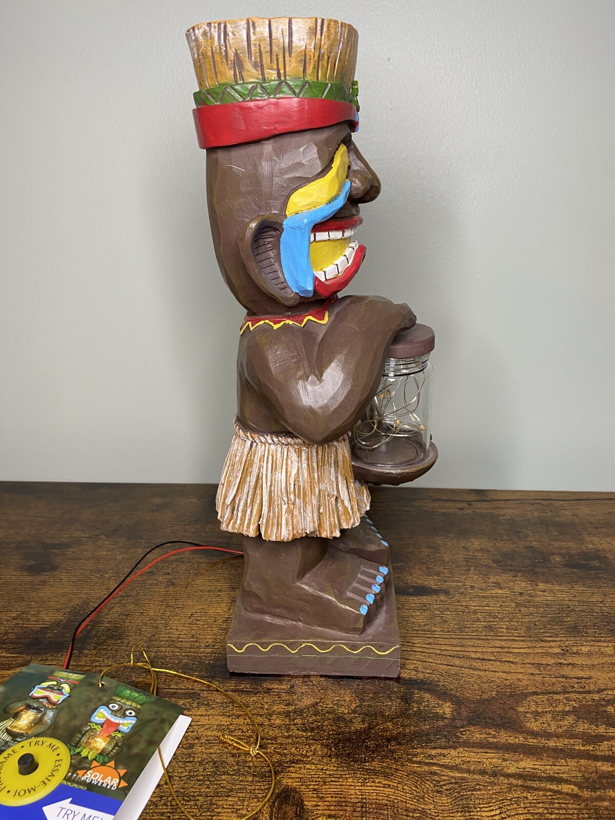 Rare hard to find - 11.5" Solar Powered Torch Tiki Garden Statue is a Polynesian-inspired resin statue in the shape of a Tiki statue with a firefly lantern. It stands at 11 inches tall, suitable for both indoor and outdoor use. This Polynesian tropical-themed statue is powered by solar energy, making it perfect for summer occasions and adding a fun and whimsical touch to your garden decor. It serves as a unique outdoor decoration, embodying a Polynesian cartoon in a freestanding statue for a touch of island charm.