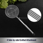 HEAT RESISTANT & DURABLE: This solid strainer is made of premium food grade 18/8 stainless steel which is heat-resistant and sturdy, won’t be deformed even after long-term-use, meanwhile, the material are much safer and more durable than plastic or other materials in the market. DIMENSIONS: The whole length is 15.5 inches, diameter of the the bowl is 5.4 inches and depth is 1.6 inches, with the proportioned slots you can quickly scoop out a large amount of food within a short time, which is perfect for French fries, doughnuts, boiled eggs, hotpot, seafood, chicken soup,or wash fruits. ERGONOMIC LONG HANDLE: The long handle protects you from oil splashing and burning when cooking at high temperatures. 4 side-by-side crafted attachment between the handle is stronger than normal handle, but lighter than solid handles. DOUBLE COIL DESIN: The unique design enhances the bearing capacity of the strainer. It is faster than a fine mesh strainer, retains the temperature but leaving little oil or water, No more need to endure high temperature, improving efficiency by quick and massive frying and cooking. EASY TO USE, STORE & DISHWASHER SAFE: This utensil is a nonstick perforated frying tool, so don’t worry about the sticking and residue. A hanging hole at the end for hanging on the hook making it convenient to store and use, so that your kitchen is no longer cluttered. Overall It is also dishwasher safe.v
