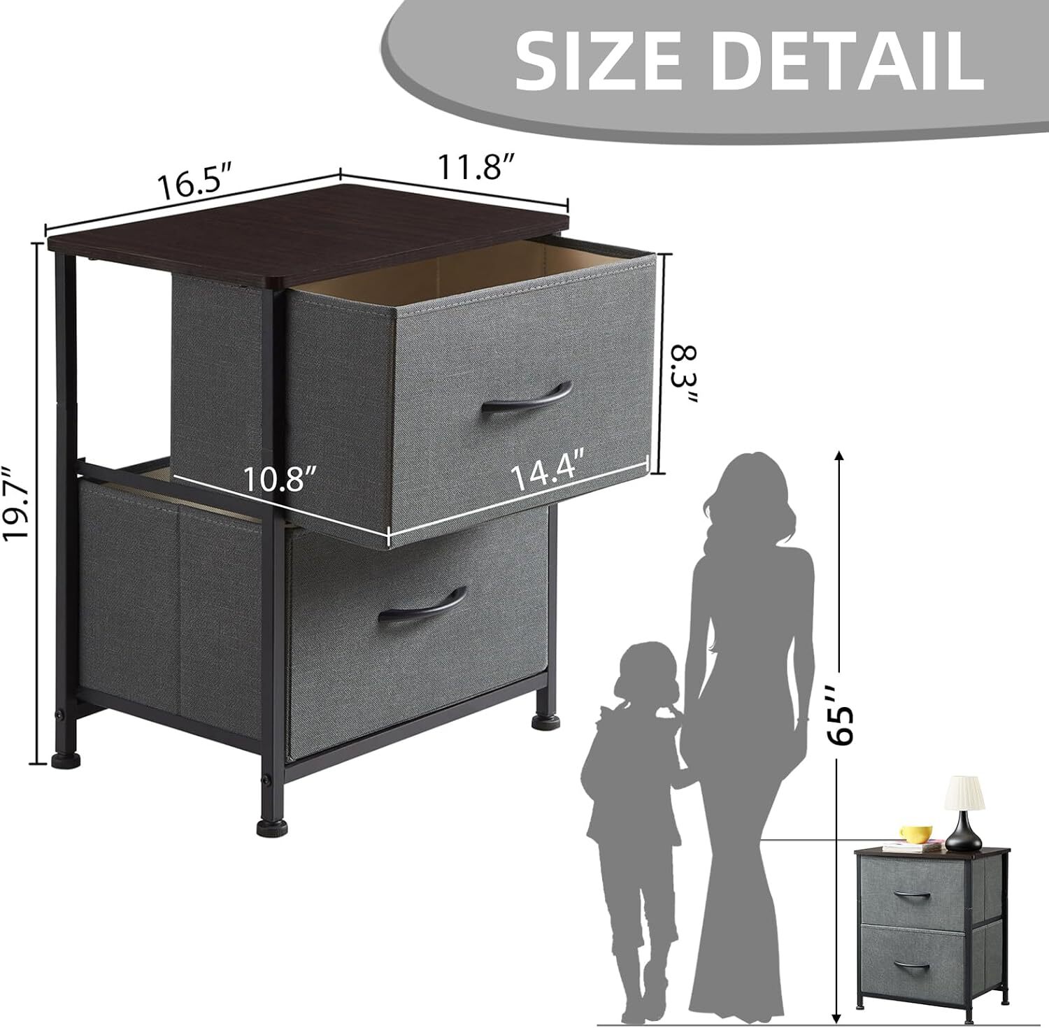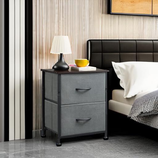 Somdot Nightstand with 2 Drawers, Bedside Table Small Dresser Charcoal Grey Product Details Brand: Somdot Product Dimensions: 11.8"D x 16.5"W x 19.7"H Maximum Weight Recommendation: 35 Pounds Color: Charcoal Grey Product Care Instructions: Wipe with Damp Cloth Item WeightFrame Material: 3.47 KilogramsMetal Top Material TypeShape: Engineered WoodRectangular Multipurpose: Somdot 2 drawers nightstand is ideal for beds with a height of 16 inches to 24 inches. It fits in many locations throughout your home and also can be used as an end table in living room, as a toy storage in nursery, or placed inside the closet to create extra storage. High Quality: Strong steel frame, durable wood board, adjustable plastic feet and premium fabric drawers all contribute to its sturdy construction to ensure durability against wear and tear over time. Easy Assembly: Hardware is included for hassle-free assembly. Follow the instruction and you can put it together in a few steps. Drawer dimension 14.4 inches (W) x 10.8 inches (D) x 8.3 inches (H); Overall dimension 16.5 inches (W) x 11.8 inches (D) x 19.7 inches (H). Stylish & Smart: Simple and modern style makes it fit to any decor. Lightweight design and 2 removable drawers are convenient for daily use. It works well in small areas while providing plenty of storage space, and mixes & matches with Somdot storage dressers or chest of drawers for a unique home style.