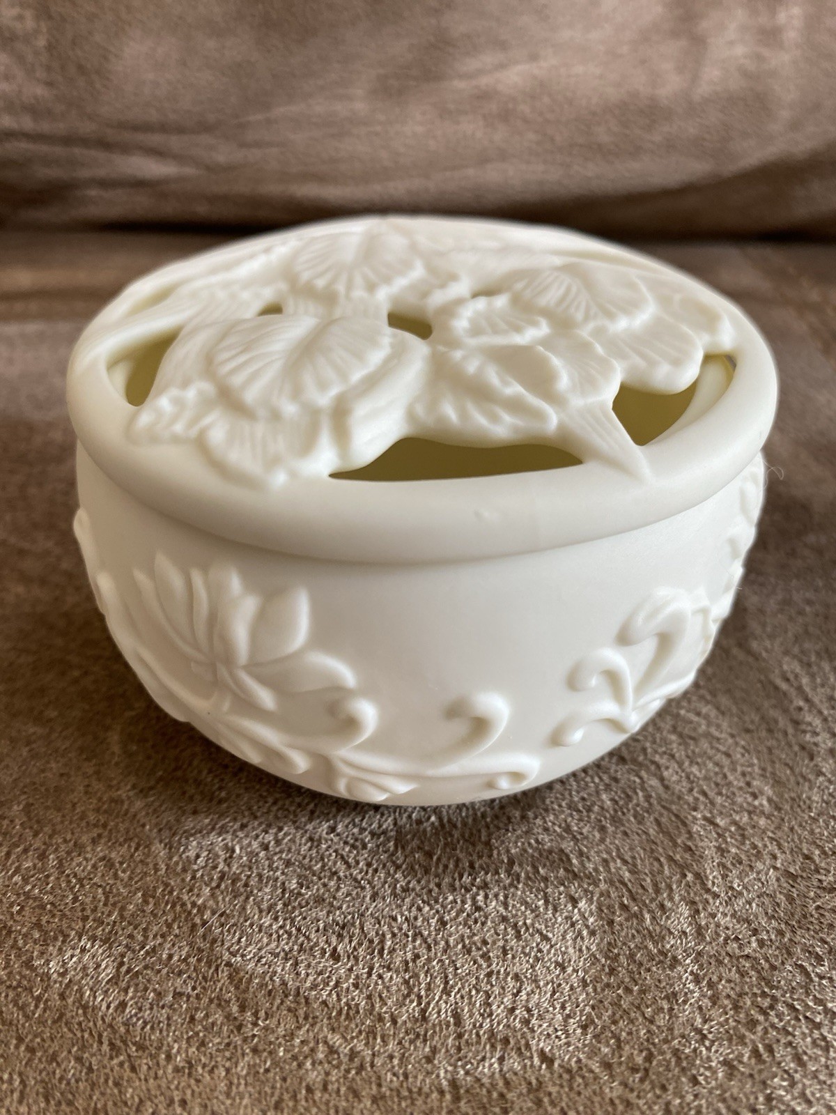 Preowned in good condition Spring Flower Bisque Trinket Box. This piece measures 3” diameter and 2” tall. There are no chips or cracks. Please see pics for details.