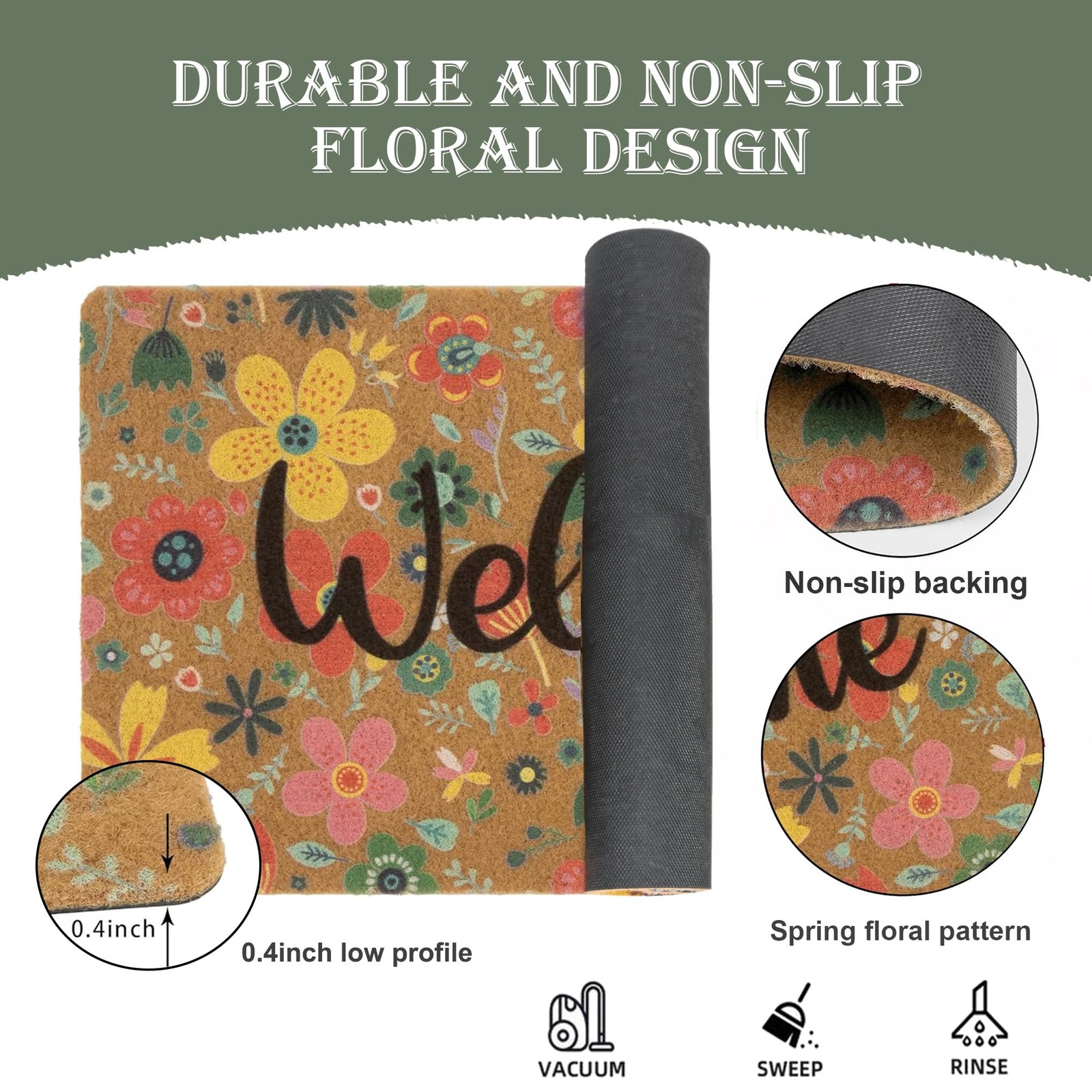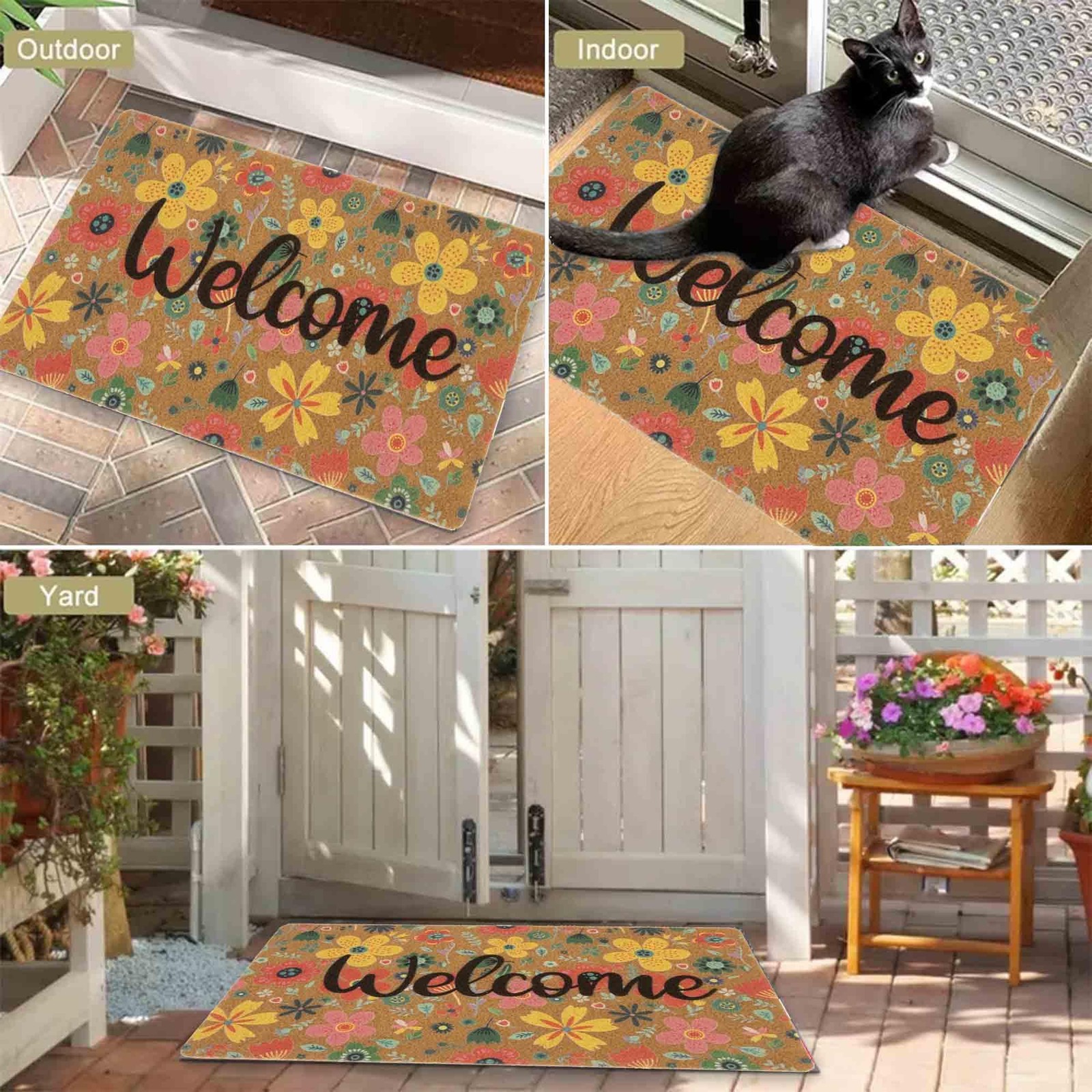 Spring Floral Welcome Mats for Front Door, Indoor, Outdoor, Entryway, Faux-Coir Seasonal Thin Doormat 17"X30", Outdoor-Porch-Rug Non-Slip Dirt-Trapping for Garden, Patio, Backyard Stable and Dirt-Trapping: Made from faux coir fabric with a Vinyl Backing, this outdoor colorful floral front door mat is designed to be stable, anti-slip, and water-absorbent, keeping your doorstep clean and tidy Low Profile & Perfect Size: Measuring 30x17 inches with a low 0.4 inches profile design, the floral doormat is perfect for easy door opening and closing. Ideal for home decor, front door mat for outside porch entrances Creative and Colorful Spring-Summer Design: Featuring a charming print of colorful flowers on the spring summer entrance door mat, this rug adds a pop of color and a joyful seasonal atmosphere to your home decor Multi-Purpose Placement: This versatile outdoor doormats for front door/back door can be placed in various areas such as the office, laundry room, entrance, porch, patio, garage, or any high traffic areas, adding a touch of style to different spaces Easy to Clean: Cleaning this washable outside door mats is quick and simple. Just spray it with a hose or use a sponge and mild detergent to remove dirt. Avoid bleaching or dry cleaning, and allow it to air dry without wringing Transform your home entrance with the spring floral decorative front door mat. Featuring a captivating print of colorful flower, it adds a trendy and lukcy flair to your decor. Perfect for spring or summer, this mat sets a welcoming tone with a deep sense of joy and festivity. Crafted from stable faux coir fabric with a rubber bottom, the door mat is built to last. Its slip-resistant and water-absorbent design ensures your doorstep remains clean and dry. Versatile enough for various areas like the front door, outdoor porch, outside entrance, garden entryway, farm doorway, and more, it adds style to any space. With its low profile and ideal size of 17x30 inches, the mat fits seamlessly on your deck or balcony without hindering door movement. It facilitates a smooth transition from outdoors to indoors. Cleaning is effortless - simply spray with a hose or use a sponge and mild detergent to remove dirt. Avoid bleaching or dry cleaning, and let it air dry naturally. Add creativity, style, and functionality to your home with the Decorative Front Door Mat. Make a statement and create a warm, inviting atmosphere that leaves a lasting impression on your guests. Transform your doorstep into a stylish and welcoming entryway today! Shipping We offer FREE shipping on all orders! We ship within Three business days of payment, usually sooner. We use a selection of shipping services such as UPS, FedEx, USPS etc. We only ship to the lower 48 states, no APO/FPO addresses or PO Boxes allowed. Local pickups and combined shipping options are not provided at this time. Return You can return a product for up to 30 days from the date you purchased it. Any product you return must be in the same condition you received it and in the original packaging. Please keep the receipt. Payment We accept payment by any of the following methods: PayPal Please pay as soon as possible after winning an auction, as that will allow us to post your item to you sooner! Feedback Customer satisfaction is very important to us. If you have any problem with your order, please contact us and we will do our best to make you satisfied. Contact Us If you have any queries, please contact us via ebay. We usually respond within 24 hours on weekdays. Please visit our eBay store to check out other items for sale! Thank you for shopping at our store.