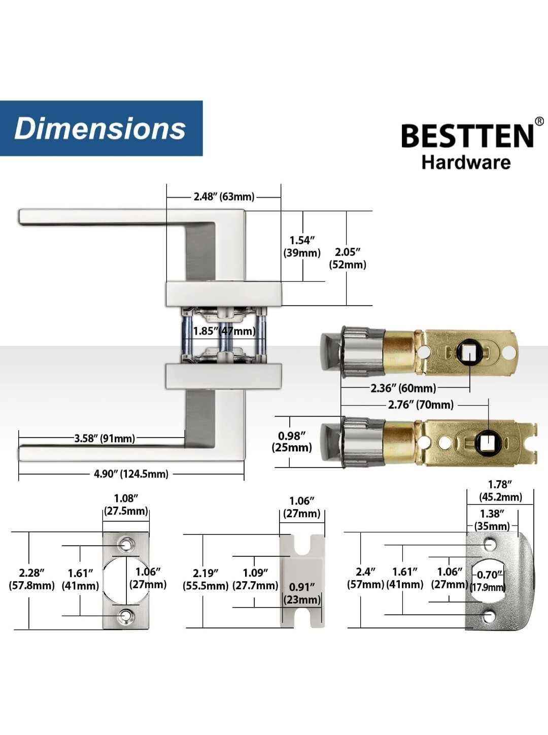 No Warranty & Support Look at ALL info and pictures before ordering 4 pack The pictures show 5. But One door knob is missing the parts. The rest (the other 4) are complete. Material Zinc Brand BESTTEN Color Satin Nickel Door Lever Exterior Finish Zinc Special Feature Easy to Install Style Passage Handle Type Lever Shape Square Finish Type Nickel Finish About this item Removable latch plate for doors with round latch holes that have not been inlet for rectangle plates. Saves time on new installation All metal construction passage door lever set. For interior closet, hallway, etc. Doors with no lock. Satin Nickel finish Fits 2-3/8" – 2-3/4"(60-70mm) backsets and door thickness from 1-3/8" to 1-3/4" (35-45mm) Reversible handle design fits both right-handed and left-handed doors Certified Grade-3 Security by ANSI/BHMA 4 pack Product Description BESTTEN Monaco Passage Door Lever Set The electroplated finish is fashionable and hard-wearing to look great for years to come. The robust all metal construction includes a solid metal lever, a steel latch, and heavy duty steel rack and cam mechanism with hardened steel components, providing outstanding strength and durability. The lever is reversible to fit both right and left-handed doors. An adjustable latch design fits almost all standard doors. All of these features add up to a door lever set of unparalleled quality, style, and longevity in its class. Click to play video Product information Item details Brand Name BESTTEN Included Components Latch Model Number DL2-PS-SN-5PK Manufacturer BESTTEN No Warranty & Support ASIN B0963PY6HT Measurements Item Weight 1.96 Pounds Unit Count 5.0 Count Number of Items 4 No Warranty & Support Materials & Care Material Type Zinc Metal Type Zinc Handle Material Metal Style Color Satin Nickel Door Lever Style Name Passage Exterior Finish Zinc Shape Square Finish Types Nickel Finish Features & Specs Handle Type Lever Additional Features Easy to Install Lock Type Passage Hand Orientation Ambidextrous