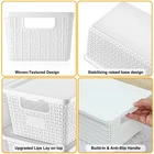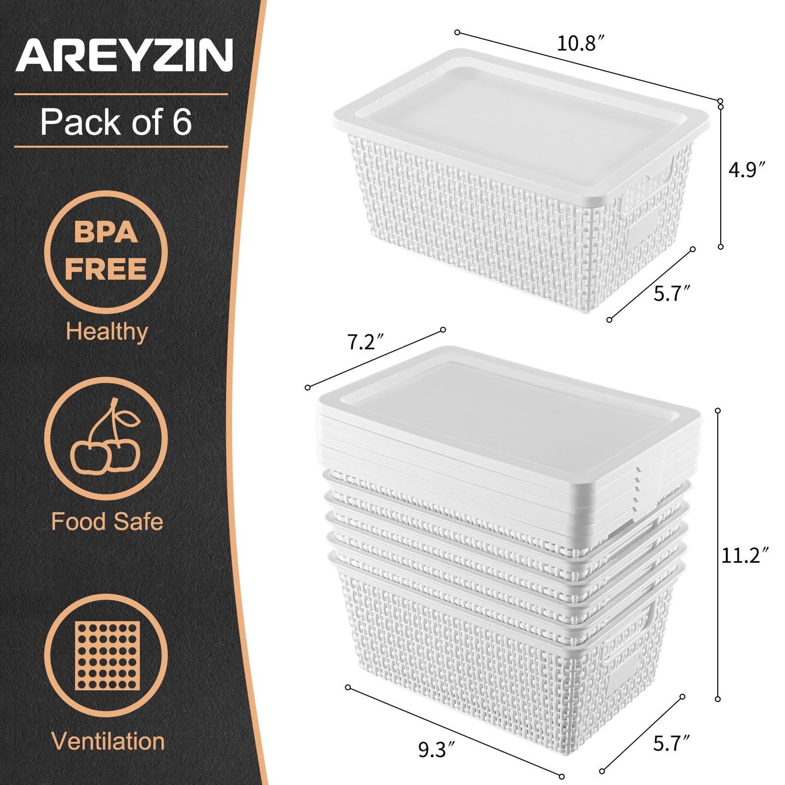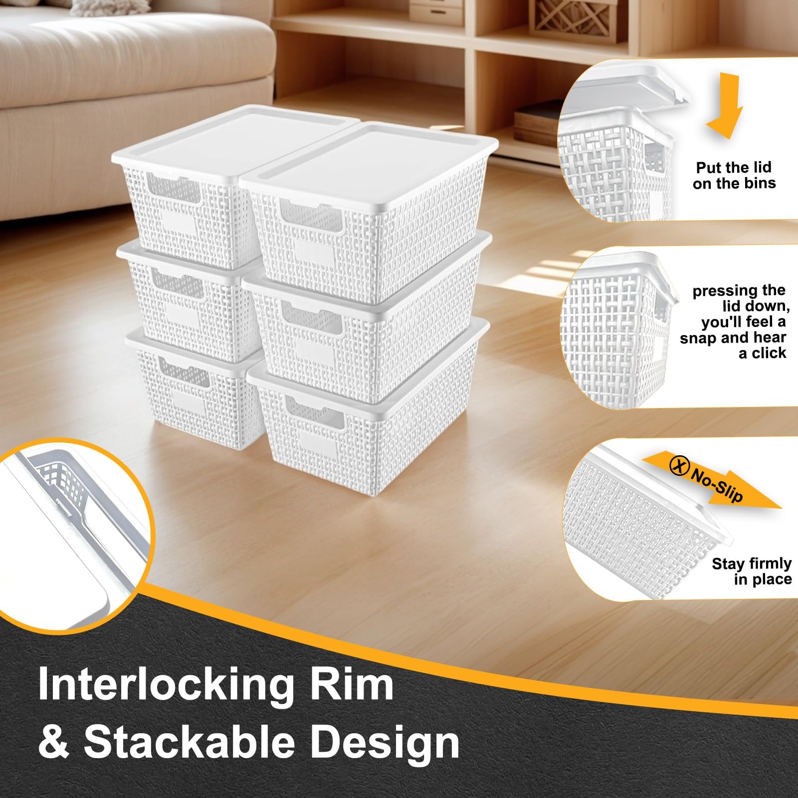 with these lidded storage bins with lids (6-Pack) - enjoy your space storage and organization * These stylish yet functional storage bins feature durable woven PP material with plastic lids. * Perfect for home organization, the 12"x6"x7" stackable baskets with lids keep bedrooms, closets, pantries and garages tidy. * The space-saving design allows vertical stacking or horizontal nesting. Ideal for storing toys, office supplies, seasonal decor and more. A versatile storage solution that combines rustic charm with modern functionality 🌿 Durable and Sturdy Storage Solution: Crafted from BPA-free sustainable plastic, these storage baskets with lids deliver lasting durability. Making the storage bins perfect for long-term organization and storage solutions in bedroom, garages, and living spaces. ✨ Luxury Woven Aesthetic: The textured rattan-look design of these small baskets transforms cluttered spaces into curated displays. Use as open shelf organizers in living rooms, walk-in closet storage, or under-bed organizers – seamlessly blending rustic charm with modern functionality. 📏 Space-Saving & Stackable: These storage boxes with interlocking lids allow vertical stacking to maximize space in apartment pantries, dorm rooms, and RV storage. Each 11"x5"x7" bin holds up to 25lbs – ideal for seasonal décor rotation or office supply organization. 🏠 Multi-Functional Home Hero: These small storage bins are a versatile solution to handle every room. Designed to fit standard shelving-Closet systems,Kitchen cabinets,Garage racks (Pro Tip: Measure your shelf depth and stack bins horizontally for custom fits!) 🤝 Warranty Guarantee: We guarantee your complete satisfaction of our organizer bins! It's easy to reach us in case of any order-related issues for friendly hassle-free customer service.