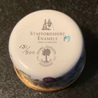 Recent Richmond, VA estate find. Offering a beautiful 1 1/8" lid diameter by 3/4" high, round, enamel trinket box with a screw down lid by Staffordshire Enamels for The Historic Charleston Foundation. Limited Edition number 131 out of 500, this piece is in pri stine condition with no chips, cracks, flaking or stains; no evidence of use. The colors are vibrant and the threads for the lid are fluid and straight. Does not include the original box. Please see photographs for condition, design and dimensions. Click on each for a larger, expanded view. Photos do contain measurements. Take a moment to review our other wonderful estate finds. We do combine shipping on multiple purchases when feasible to combine for safe shipping. If you wish to combine the shipping for multiple purchases from our store, please send a message requesting combined shipping and wait for an updated invoice prior to paying. The shipping calculator is often incorrect, if you feel the shipping charge is excessive, please send us a message and we will give you an accurate shipping quote. Visit Our eBay Store: Andrews Vintage * International Buyers, please note: Import duties, taxes, and charges are not included in the item price or shipping cost. These charges are the buyer's responsibility. Please check with your country's customs office to determine what these additional costs will be prior to bidding or buying. Also, we ship our items extremely fast but sometimes packages may be held by customs which can occasionally delay shipments.*