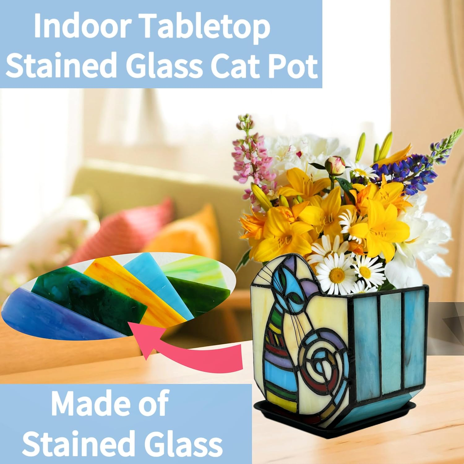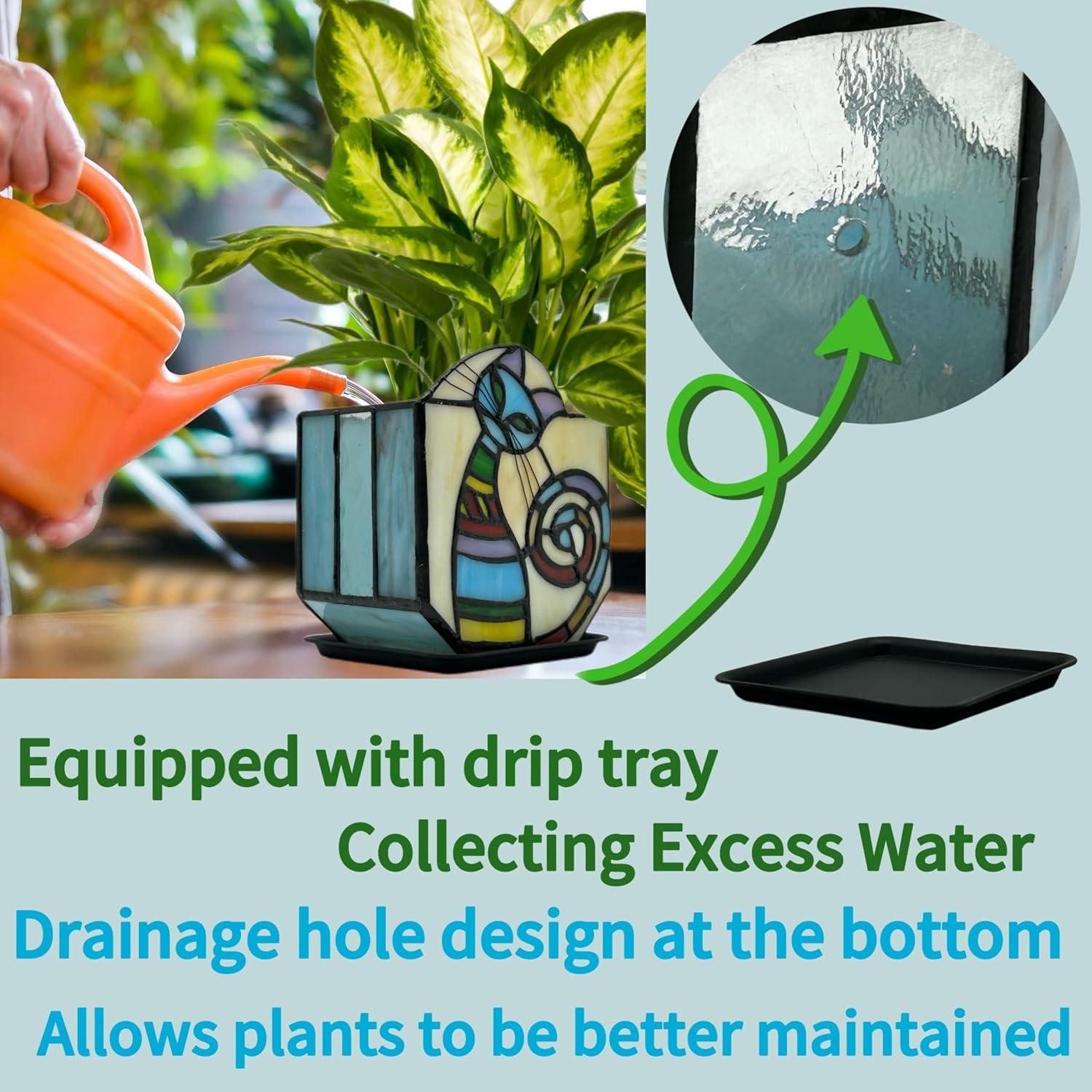 Menu Other Items Feedbacks About Us Contact Us Add To Favorites Stained Glass Cat Unique Plant Pot, Indoor Planter with Drainage and Tray,Succulent Plants Flower Pot,Cat Lover Gifts,4.6X3X5.15 In Handcrafted Craftsmanship: The cat container is made of colored glass, hand-cut and ground; Craftsman spirit and pursuit of perfection created this colored glass flower pot craft, own this fun cat, embrace the joy of nurturing plants while immersing yourself in the fascinating beauty of colored glass art Drainage System:With drainage holes to ensure proper water flow and a tray to catch excess water, this stained glass cat plant pot is both practical and visually appealing for any home or office decor Indoor and outdoor plant decoration: Enhance your indoor or outdoor space with charming colored glass cat pots, perfect for cat lovers, bedrooms, gardens, living rooms, dining rooms, bedrooms, windowsills and other scenes to display unique and interesting cats, all have the effect of creating a warm and comfortable atmosphere Versatile and attractive: Can also double as a pen holder or candle holder, when candlelight shines through the stained glass, it will present the beauty of different colors, which will surely attract people's attention and admiration. Add a touch of creativity and charm to your space with this stained glass cat unique planter Cleaning Method: When cleaning is needed, just rinse the cat container with clean water; wipe it dry with a rag after cleaning; set it aside to dry; in order to make the cat flower pot more beautiful and shiny, we apply a layer of paraffin on the welding surface; if you don’t like it, you can wipe it off with a cloth Perfect Thoughtful Gift:Surprise your loved ones with a thoughtful gift of this adorable cat planter. This charming cat is a great way to celebrate moments like housewarming, Valentine's Day, Mother's Day, Christmas and New Years, and it will be a very memorable gift Handcrafted Craftsmanship: The cat container is made of colored glass, hand-cut and ground; Craftsman spirit and pursuit of perfection created this colored glass flower pot craft, own this fun cat, embrace the joy of nurturing plants while immersing yourself in the fascinating beauty of colored glass art Item Specification Planter Form Plant Pot Style A Standing Cat Number of Levels 1 Number of Pieces 1 Indoor/Outdoor Usage Outdoor, Indoor Mounting Type Tabletop Color A Standing Cat Special Feature Drainage Hole Product Dimensions 4.6"D x 3.26"W x 5.15"H Material Stained Glass Country of Origin China Plant or Animal Product Type Monstera Deliciosa,Pothos Item Weight 10.9 ounces Shape Rectangular Size 4.6 x 3 x 5.15 inch Finish Type Polished Included Components Tray Dimensions Shipping Returns Additional Info Product Dimensions: 3.26 "h x 4.6 "h x 5.15 "h. Weight: 10.9 oz Fast shipping is very important for us. Our standard shipping service is FREE. Your order will be shipped within 1-3 business days upon full payment received. Most items are delivered within 3-5 business days, however, please allow 3-10 business days. We are shipping only to USA. We only ship to the confirmed Paypal address. We reserve the right to cancel any order for any reason at any time. We are not responsible for undeliverable addresses. We offer a 30 day return policy from checkout winning date. Your satisfaction is guaranteed! If for any reason you are unhappy with your item, just return it within 30 days for a full refund, minus shipping cost. Please contact us prior to initiating a return so that we can issue you a refund authorization. Items defective upon receipt must be packaged in their retail packaging as if new and returned with a detailed description of the problem. Return shipping fees are not refundable. We reserve the right to decline any returns if the above guidelines are not followed. All of our items, unless otherwise stated, will only run on 120 volts. Please check to make sure your country complies with these specifications. If you have a problem or question regarding your transaction please contact us before leaving any type of feedback. We will work with you to resolve any problem you may have.