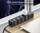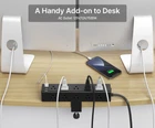 1 15 outlets desk clamp power strip with QC 3.0 USB A and PD 3.0 USB C ports, and ordinary smart USB ports. Come with 6 ft right-angle flat plug can easy to plug in hard-to-reach outlets. Great addition to desk edge workspace. 45W USB-C port that enough to power a laptop, offer output: 125V/60HZ/12A/1500W. QC3.0 USB-A Max 5V/3A, 9V/3A, 12V/3A. PD 3.0 USB-C Max 5V/3A, 9V/3A, 12V/3A, 15V/2.5A, 20V/2.25A. (When use alone). Smart USB-A offer 5V/2A. Can run up to 19 devices. Extreme desktop space management, L: 8.46 inch * W: 2 inch * H: 2 inch small outlet form factor, only need a small space between the table and the wall. the max desk edge width is about 1.6inch, The upgraded plastic pad can protect your desktop well, desktop accessories gifts for men. Come with Off/On switch and reserved a widely spaced outlet to plug desk electronic accessories large plugs. Don't need to punch holes in the table. 1200J surge protector to absorb excess current to protect sensitive devices. Offer different cable lengths for different needs. Made of ABS and fireproof material, short-circuit, grounded, overload, over- voltage protection safety system. Please check whether each port is working properly before use. Say goodbye to annoying bending over to the floor looking for a spare close enough outlet.