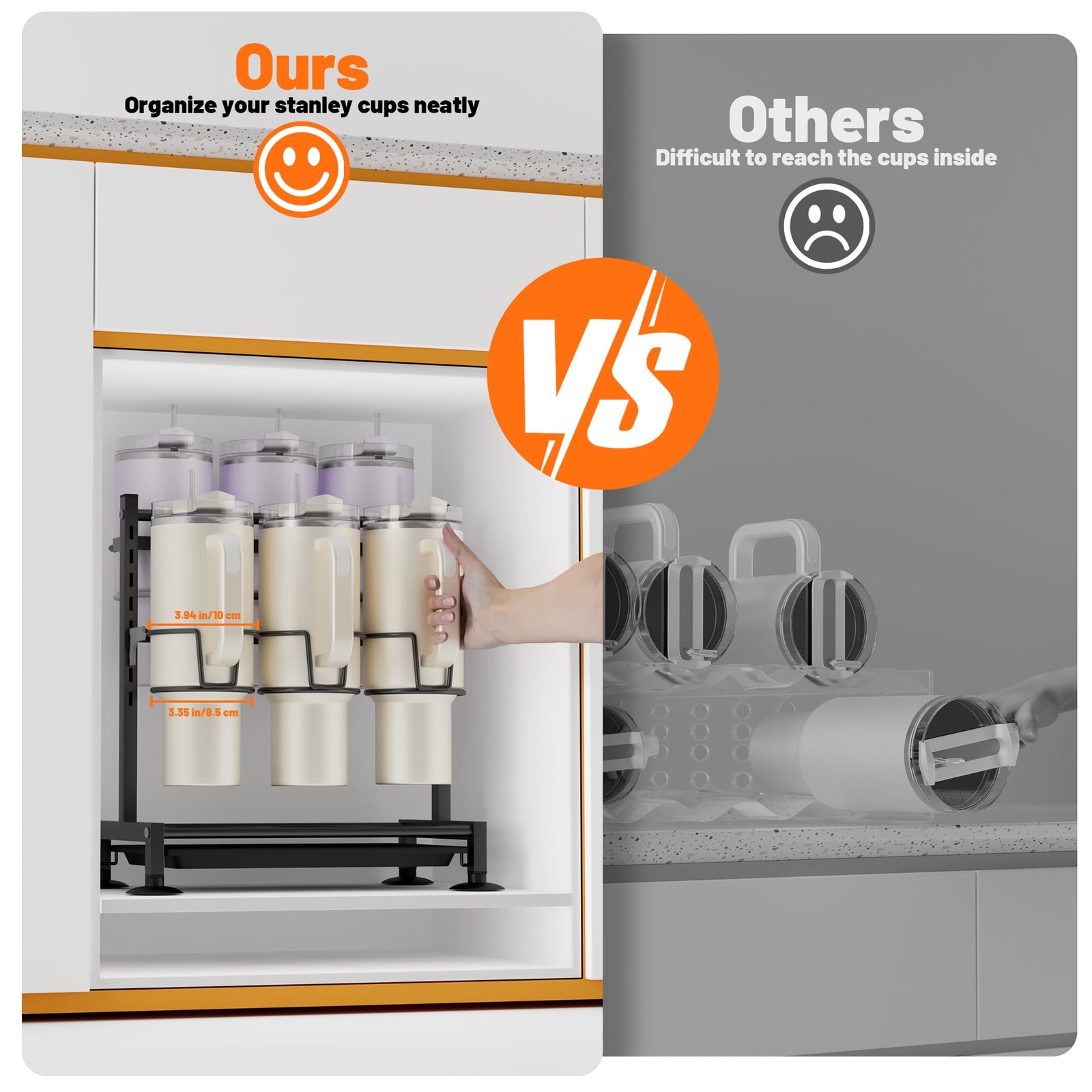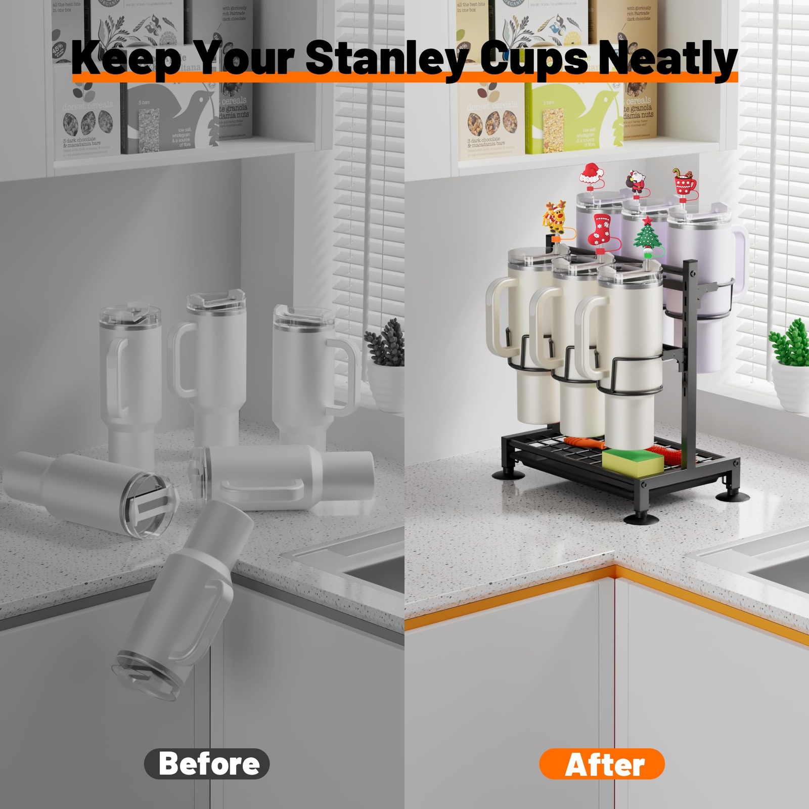 Organizer for Stanley Cups:water bottle organizer is designed for stanley 40 oz tumbler with handle.Moreover,it is compatible with other 40oz water bottles as well,such as Owala 40oz, Simple Modern 40oz, Soufull 40oz,etc.. Easy to Install:The tumbler organizer is convenient to install,and then you can display your stanley cups and keep them organized. Save Space:The cup holder can definitely help you save space of your cabinet or counter,instead of making these place messly due to put your cups on here. Quality Material:Made of high-quality materials,the item is sturdy and stable,and can hold your cup without shaking. Ideal Gift:You will get 1 tumbler organizer and 6 pcs straw covers.Choose our water bottle organizer,and give a perfect gift for stanley cup lovers in Christmas,Halloween,and birthday.