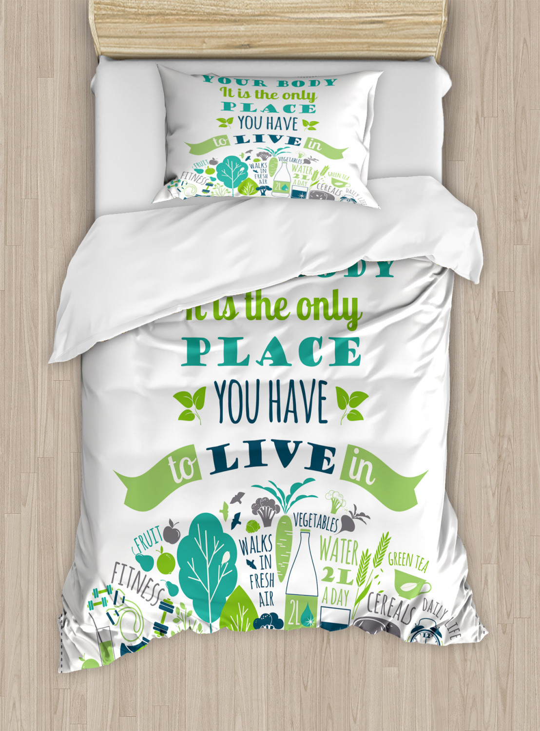 Fitness Duvet Cover Set King Size Positive Life Phrase with 2 Pillow Shams Time to embrace modern looks, feel-good fabrics, and high-quality materials! King, queen, or twin - these 3 pcs duvet cover sets will work in any bed for any season! Woven from 100% brushed microfiber fabric, our duvet cover collection is constructed for maximum strength and ultra comfort only for you and your beloved ones. All you need to do is to simply put our duvet cover on your comforter and secure it with zipper closure, and enjoy your new bedding set! MEASUREMENTS: KING SIZE SET: Duvet Cover (104" W X 88" L) and 2 Pillow Shams (36" W X 20" L). QUEEN Size Set: Duvet Cover (88" W X 88" L) and 2 Pillow Shams (30" W X 20" L). Twin Size Set: 1 TWIN Duvet Cover 68" X 88" + 1 Pillow Sham 30" X 20". The duvet cover FEATURES hassle-free hidden zipper and the pillow shams have an envelope closure. Please note that COMFORTER NOT INCLUDED IN THIS SET. This only duvet cover, allowing you to protect the comforter/duvet insert from dust, mites, and other stains. WRINKLE FREE - The microfiber material creates ultimate softness and comfort, also provides wrinkle, fade, and shrink resistance when properly cared for. Very durable and sustainable material that will not endanger your health or the environment, either. No chemicals used, No dye substance harming the health of you or your family, %100 microfiber recyclable environmentally friendly fabric. LOW MAINTENANCE: Machine washable in cold water. Suitable for tumble dryer use on low heat. Can be ironed on medium heat when necessary. Do not bleach. Choose your style between thousands of different and creative patterns. Or simply find your perfect gift idea ever for housewarming, birthday, bridal shower, Christmas, Mother’s Day, and newlyweds… You can find a theme for everybody and every interest in our Ambesonne Store. The images we display have the most accurate color possible but, due to differences in pc monitors, there can be slight color differences between the product and the image. Due to manual measurement, please kindly allow 1-2 cm discrepancy. The Duvet Cover and Pillow Shams are printed on the FRONT SIDE ONLY, the back of them are PLAIN WHITE-COLORED. This is ONLY the Duvet Cover, sold WITHOUT the Comforter.