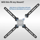 VIVO Adapter Solutions - This VESA Adapter Kit makes it possible for a large LCD screen to fit standard VESA mounts. Adapter Function - Allows any screen with VESA hole patterns up to 400x400mm to fit standard VESA mounts with 75x75mm or 100x100mm mounting compatibility. Solid Steel Construction - High gauge cold rolled steel with powder coated finish ensures long-lasting quality and enables these sturdy brackets to support weights up to 99 lbs. Low Profile - The black matte color blends well with most monitors and mounts to retain a low profile appearance. Easy Installation - A universal hardware pack is included along with all the necessary instructions to get your screen mounted to a compatible stand in no time! Product Description MOUNT-AD4X4 If you have a TV with 400x400mm mounting holes and can't find a VESA compatible mount, we have a solution! With MOUNT-AD4X4 from VIVO, a standard 75x75mm or 100x100mm VESA mount will now fit screens with VESA patterns up to 400x400mm! Solid steel construction makes these brackets designed for security, durability, and scratch resistance. *Check MOUNT and TV Compatibility* FEATURES Increase Mounting Options This sturdy adapter allows screens featuring up to 400x400mm VESA mounting holes to fit monitor stands that never fit before! Now compatible with VESA 75x75mm and 100x100mm wall and desk mounts, display options have increased for your screen! Easy Assembly All the necessary screws and hardware are included for fast and easy assembly, so you can get your screen mounted and providing comfortable viewing angles in no time! Solid Construction These solid steel adapter brackets are built for scratch resistance and durability, supporting up to 99 lbs of weight to accommodate your TV display. Please check the weight capacity for the mount that you want to use as well to make sure it can also hold your screen. Allows VESA 75x75mm and 100x100mm mounts to fit up to 400x400mm mounting patterns Color: Black Material: Steel Surface Finish: Powder Coating Length of Bracket: 10.5” Weight Capacity: 99 lbs