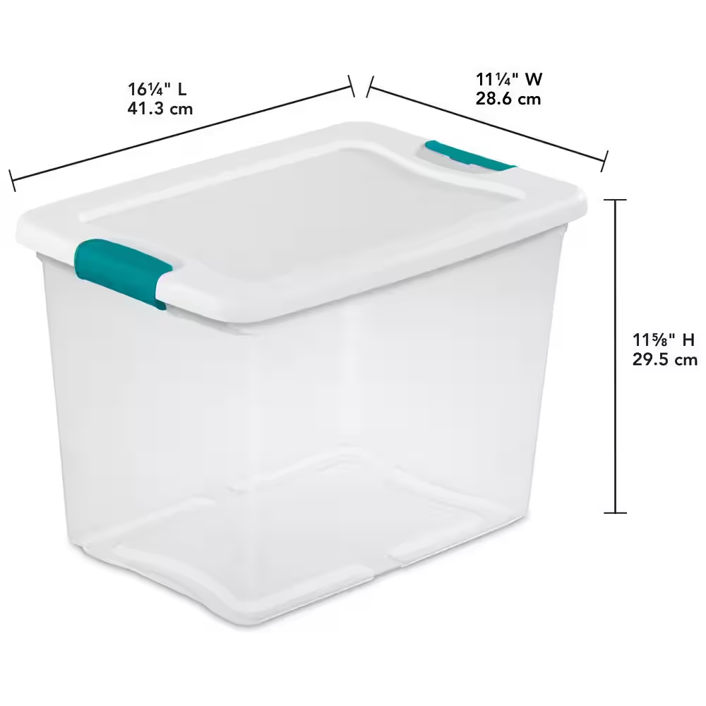 Sterilite 25 Qt Plastic Clear Stackable Latching Storage Box Container Latching Boxes feature modern styling, a wide array of sizes, secure latches and an innovative hinging lid. Hinged lid works by simply undoing 1 Latch and lifting the lid. The other latch stays attached and acts as a hinge, even when the lid is open all of the way, to provide easy access with 1 hand. 7 Sizes solve many household organizational challenges. Select sizes share a lid, allowing both shallow and deep sizes to be stacked and stored in the same footprint. Durable latches attach lid to base and provide a comfortable grip for carrying Innovative latch allows lid to be hinged, for easy access with 1 hand Efficient new space saving shape See-through base allows for quick viewing of contents Recessed lids allow for secure stacking and select sizes share a lid for simplified merchandising