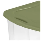 Make storing and moving easier than ever with the Sterilite EZ Carry Clear Storage Bin with Lid! Innovative through-handles provide a comfortable, full grip for easy lifting and carrying, making transport through doorways and up or down stairs a breeze. Recessed lids allow bins to stack neatly to maximize vertical storage space, while the clear base lets you locate contents quickly. This 70 Quart plastic storage container is perfect for storing blankets, seasonal clothes, sporting gear and more. Conquer your organization challenges with the EZ Carry line, ideal for any room in the home or for on-the go storage needs! The overall assembled dimensions of this item are 24 5/8" L x 18 3/4" W x 13 7/8" H. Sterilite 70 Quart EZ Carry, Plastic Storage Bin, Full-Grip Handles, Green Outside Dimensions: 24 5/8" x 18 3/4" x 13 7/8" Interior Dimensions at bottom: 18 3/8" x 15 1/8" x 13 1/8" Carry through handles allow full grip access for more comfortable and easier transport Clear plastic bin allows for easy identification of stored items at a glance Recessed lid allows bins to stack securely to maximize vertical storage space Ideal storage solution for moving, designed for enhanced portability Mix and match with EZ Carry Totes - shared lids allow for the 70 Qt and 17.5 Gal to stack interchangeably Use good judgment when stacking items, keep heaviest bin at the bottom BPA-free and phthalate-free