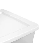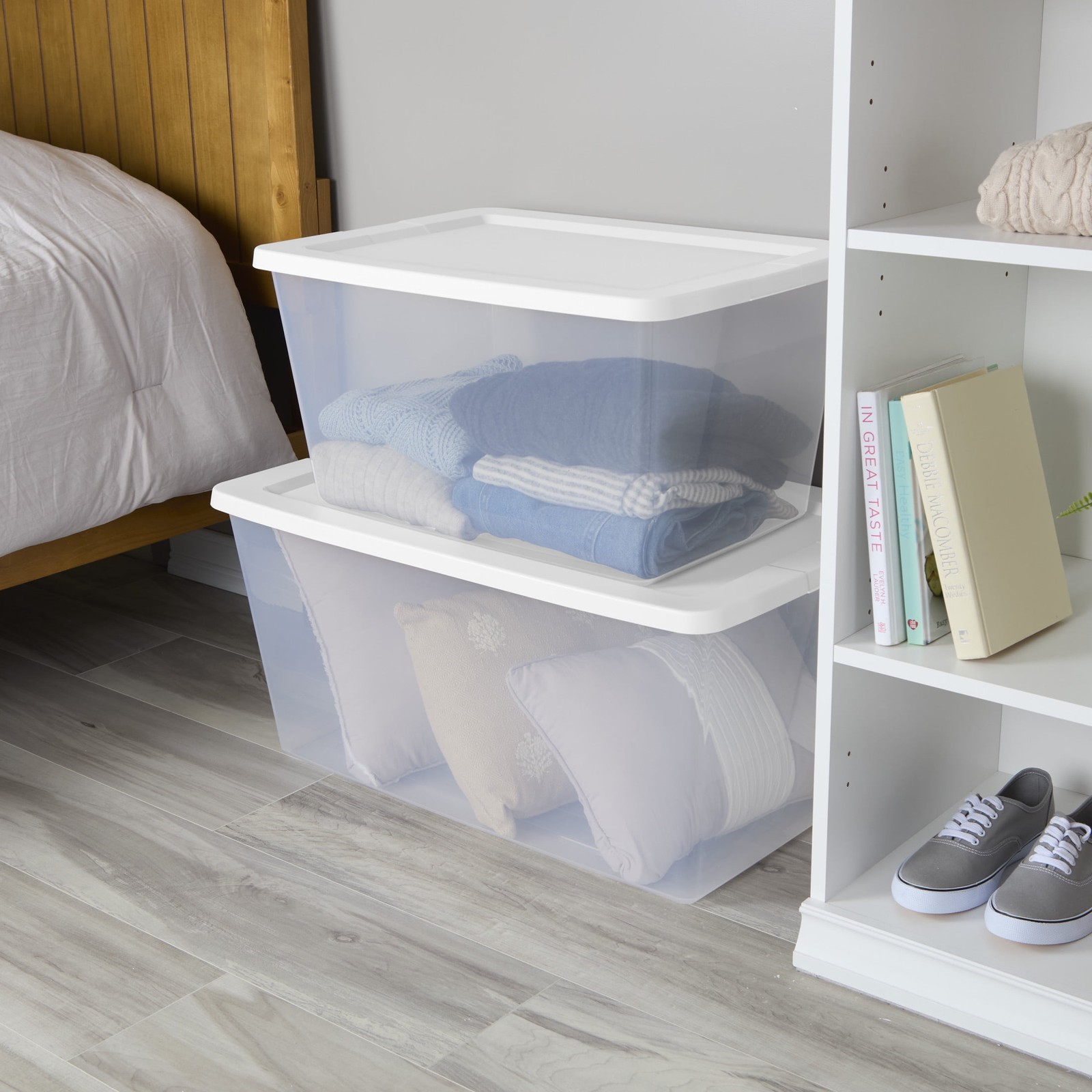 Organization is made easy with the Sterilite 90 Quart Clear Storage Bin with lid! The clear base lets you see what's inside while the snap-on lid keeps everything contained. The space-efficient shape and deep recessed lids allow bins to stack securely, maximizing vertical storage space. Sort and store a variety of household items to bring order to closets, bedrooms, and more! Ideal for storing sporting gear, sleeping bags, seasonal clothing and other larger, bulkier items. Note: Use good judgment when storing items, don’t overload, keep heaviest bin at bottom, and don’t stack too high. The overall assembled dimensions of this item are 29 3/8" L x 18" W x 13 5/8" H. Sterilite 90 Quart Storage Box, Clear Plastic Storage Bin with Snap-on Lid, White Outside Dimensions: 29 3/8" x 18" x 13 5/8" Interior Dimensions at bottom: 24 3/4" x 16 5/8" x 12 7/8" Clear base allows you to view contents at a glance Snap-on lids keep contents contained and are recessed to allow for stacking Large capacity is ideal for bigger, bulkier items and basic storage needs throughout the home Use good judgment when stacking items, keep heaviest bin at the bottom BPA-free and phthalate-free