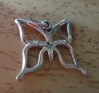 This sterling silver butterfly charm is so cute and just the perfect size! It is 1.5 cm tall and 1.7 cm wide. It is an open fine outline of a butterfly, but not flimsy at all! It is so cute and not too big. The pink color is a reflection of my hand. Look also in my ebay store for the 6000 charms, charms bracelets, rings, chains etc...