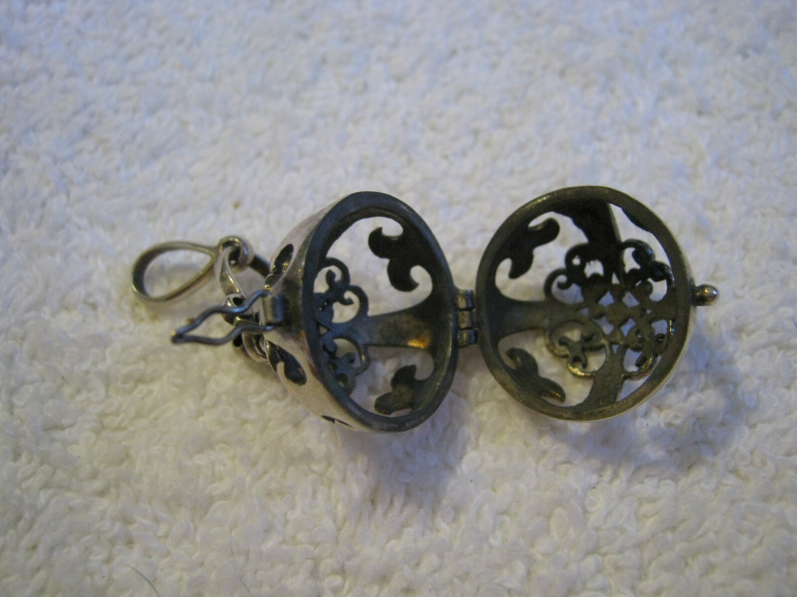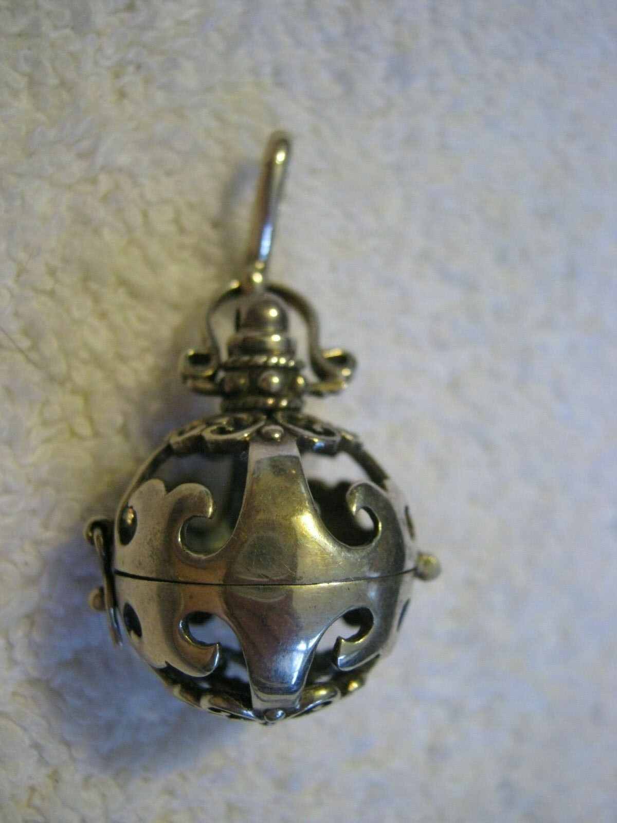 Please examine photos. They are THIS item and are part of the description. I do not use stock photos or photos of other people’s items. This is a silver (unmarked, tests for sterling silver) spherical locket with cutout scrollwork intended to diffuse essential oils. It needs your volcanic stone ball or balls, about 15mm in diameter, and your essential oils. Overall drop dangle is about 1 3/4". Can be used as a locket for anything you like. With this item get FREE SHIPPING with tracking in the USA Significant flaws not depicted in the photos are described here-with, minor flaws and normal wear are not. Unless the item is described as new, assume there will be minor flaws or wear commensurate with a used item of given age. If Free Shipping is offered it will be by the cheapest method possible, for books that will be Media Mail. If Buyer is at all concerned about the time it takes for delivery, please consider the option of paying extra for Priority Mail. Positive Feedback is greatly appreciated and shall be given in return. If Buyer intends to leave negative feedback of any kind, please contact me first so I can try to resolve the issue. Please ask any questions you might have before bidding. I will be happy to answer questions about a particular item to the best of my ability. PLEASE, if you plan to buy more than one item for the same shipment, make your payment AFTER you are finished shopping and have a combined invoice. If you are entitled to any discounts for multiple purchases, wait until I have applied those discounts and "Final" invoiced you before paying. I will not be able to issue discounts after the invoice is paid as a result of E-BAY requirements. Please contact me if you have any questions. Thank You.