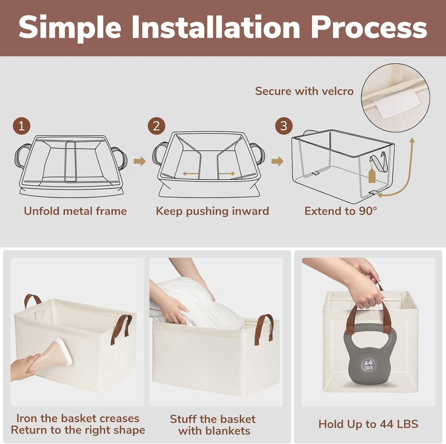Premium Quality: Our storage bins boast a waterproof interior coating and are made with top-quality materials. The addition of base plates and metal frames provide superior load-bearing and upright stability for maintaining form and structure even when empty or stored Stylish and Decorative: With leather handles and a neutral color, these large storage bins add a touch of elegance while serving as functional storage solutions. They're an ideal choice for a nursery's shelves or under the crib for storing baby essentials and clothing Versatile Storage: Measuring 16 ¾" L x 11" W x 9 ¾" H and holding up to 44 pounds, these decorative storage bins can handle a wide variety of items. Whether storing clothes, towels, blankets, toys, books, magazines, pet supplies, office and craft supplies, or more, these bins are perfect for any organizational need Multiple Applications: The regular shape of these baskets makes them perfect for fitting into various shelves and closets for tidy storage. They're also sturdy enough to be used as clothing organizers to help keep bedrooms, living rooms, laundry rooms, or dorm rooms tidy and efficient.These baskets can maximize the utilization of space Space-Saving Design: When not in use, these closet storage bins can be folded to maximize simplify storage. They'll help you keep your living area organized and clutter-free without sacrificing style or functionality Product description