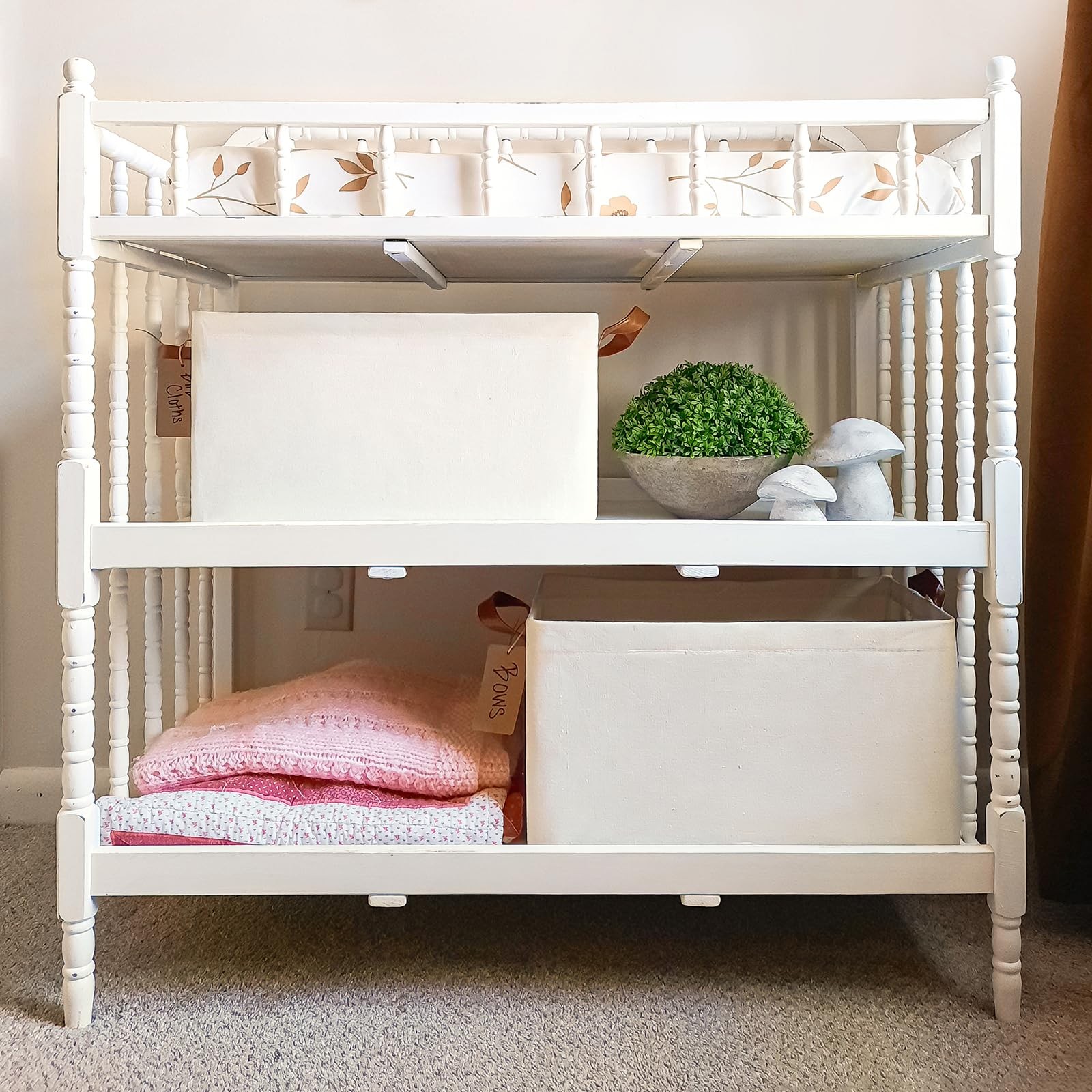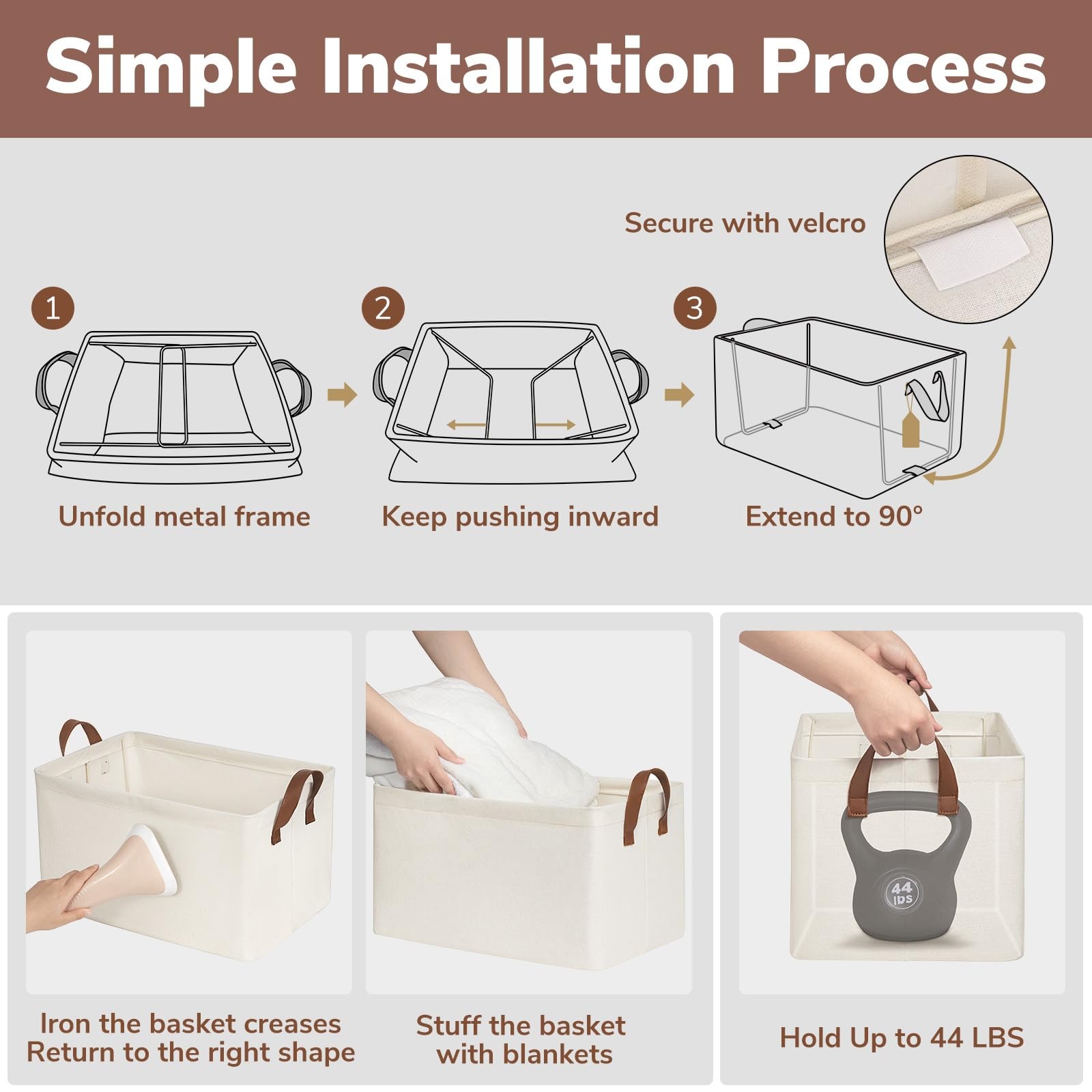 Closet Storage Bins - Material: Canvas - Size: 16 ¾" L x 11" W x 9 ¾" H " Different ways to display the shelf baskets: - Living room: Perfect to hold throw pillows, toys, towels beside the sofa. - Bedroom: Store your bed pillows and clothes at bedtime instead of throwing them on the floor or a chair. - Kid's room: Perfect for storing kid's clothes, toys and towels. - Laundry room: Perfect for storing towels, NOTE: - Packing: The basket comes floded. These rectangular baskets are easy to install and can be kept upright. - Cleaning: Not support for machine wash. If you really want to clean it, we would suggest to use a wet towel to clean it. - Storing: This collapsible storage basket can be folded up when not in use, does not take up space. Premium Quality: Our storage bins boast a waterproof interior coating and are made with top-quality materials. The addition of base plates and metal frames provide superior load-bearing and upright stability for maintaining form and structure even when empty or stored Stylish and Decorative: With leather handles and a neutral color, these large storage bins add a touch of elegance while serving as functional storage solutions. They're an ideal choice for a nursery's shelves or under the crib for storing baby essentials and clothing Versatile Storage: Measuring 16 ¾" L x 11" W x 9 ¾" H and holding up to 44 pounds, these decorative storage bins can handle a wide variety of items. Whether storing clothes, towels, blankets, toys, books, magazines, pet supplies, office and craft supplies, or more, these bins are perfect for any organizational need Multiple Applications: The regular shape of these baskets makes them perfect for fitting into various shelves and closets for tidy storage. They're also sturdy enough to be used as clothing organizers to help keep bedrooms, living rooms, laundry rooms, or dorm rooms tidy and efficient.These baskets can maximize the utilization of space Space-Saving Design: When not in use, these closet storage bins can be folded to maximize simplify storage. They'll help you keep your living area organized and clutter-free without sacrificing style or functionality