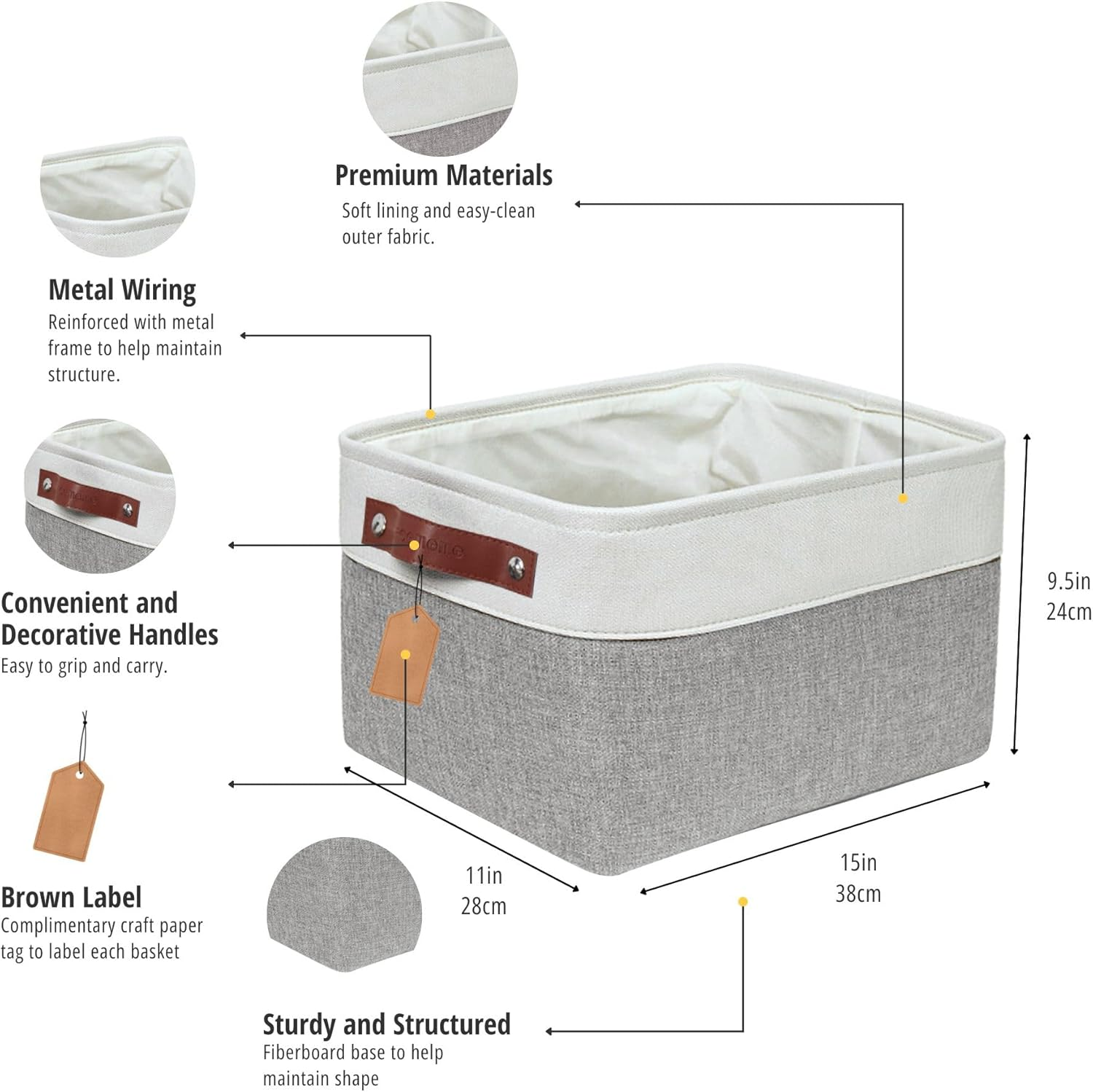 Cotton Fabric, Eva, Polyester, Faux Leather Sturdy Construction: DECOMOMO closet storage bins are reinforced with upper metal frame and 2.5mm MDF fiberboard bottom to keep the baskets upright. Comes with dual faux leather handles with the weight bearing capacity of 25 lbs. Label & Decorate: DECOMOMO’s fabric storage bins come with complementary craft paper tag and jute string to label each basket and identify the items inside easily. Trusted Brand: Since 2017, DECOMOMO has been dedicated to superior storage solutions. We prioritize 100% customer satisfaction, backed by a money-back guarantee. Need assistance? Contact us on Amazon for a response within 24 hours. Multi-Purpose: Use these as foldable storage baskets for shelves, closet storage bins, linen closet organizer, nursery basket storage, kid’s toys, pet products, laundry, towel, blanket, bedsheet, etc. Large Storage Bin: Set of 3 for better value and shopping convenience. Dimensions (each): 15” (L) x 11” (W) x 9.5” (H) / (38cm x 28 cm x 24 cm). DECOMOMO's decorative storage boxes can be used in bedroom, living room, kitchen, office, closets, and cabinets. Care Tip: Our foldable baskets can be steam ironed or stuffed with blankets to get rid of wrinkles. These are easy to clean, just dust with a dry cloth, or spot clean with light soapy water when necessary. Product description DECOMOMO Additional Features Stiff Baseboard Every fabric storage bin from DECOMOMO comes with 2.5mm built-in baseboard to secure the products in place and holds up to 25lbs . Store from clothes to books, these bins are suitable for a various items in home. Long-Lasting Fabric We use extra thick 2.5mm EVA fabric on a side to ensure a greater product life span. The sides are firm enough even when it’s empty. Top Wires & Sturdy Handles DECOMOMO Baskets are constructed with top wires to hold its shape and durable faux leather handles are conveniently placed on both side to carry the bins in and out of shelves. Easy to Clean Fabric Polyester lining is easy to clean and nothing catches on the clothing when you’re taking them in and out. Spot clean with light soapy water or damped clothes when needed. Stores 25.5 L Versatile large size fits approx. 4 pairs of regular pants & 2-3 pairs of legging. Space-Saving Thoughtful design to save space when not in use. Fold flat to store in minimal space. Versatile Storage Great for organizing shelves, toys, laundry, bathroom supplies, and more! 1 Large Capacity 2 Foldable Design 3 Multi-Purpose Storage Décor Inspiration from Our Customers Organizing your closet with our bins The video showcases the product in use. The video guides you through product setup. The video compares multiple products. The video shows the product being unpacked. DECOMOMO Storage Basket for Organization Merchant Video Product Comparison Guide Add to Cart Add to Cart Add to Cart Add to Cart Customer Reviews 4.7 out of 5 stars 22,623 4.7 out of 5 stars 22,623 4.7 out of 5 stars 4,781 4.6 out of 5 stars 5,122 4.3 out of 5 stars 46 4.7 out of 5 stars 6,253 4.7 out of 5 stars 22,623 Price $24.98 $ 24 . 98 $24.99 $ 24 . 99 — — — $23.99 $ 23 . 99 $30.59 $ 30 . 59 Quantity Pack of 3 Pack of 3 Pack of 3 Pack of 3 Pack of 4 Pack of 3 Pack of 6 Dimensions 15"L x 11"W x 9.5"H 15"L x 11"W x 9.5"H 16.5"L x 12"W x 13"H 15"L x 11"W x 9.8"H 12"L x 12"W x 12"H 13"L x 13"W x 13"H 11.8"L x 7.9"W x 5.9"H Capacity 25.7 Liters 25.7 Liters 42.2 Liters 26.5 Liters 28.3 Liters 36 Liters 9 Liters Handles Short Handles Short Handles Long Handles Short Handles Short Handles Rope Handles Short Handles Materials EVA, Polyester, Faux Leather EVA, Polyester, Faux Leather EVA, Polyester, Faux Leather Cardboard, Polyester, Cotton EVA, Polyester, Faux Leather EVA, Polyester, Cotton EVA, Polyester, Faux Leather