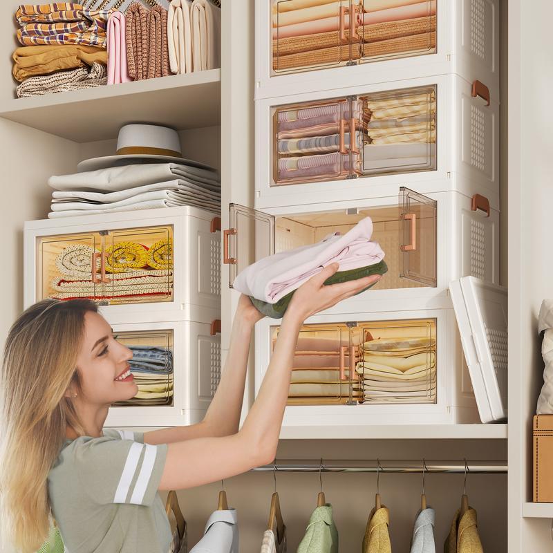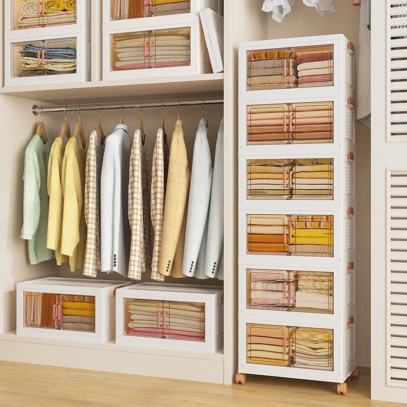 Ensure you select the right size before purchase. Dimensions(inches) Small 15.5*9.8 length*depth Portable Folding Storage Bins: These collapsible bins require no tools for installation. Disassemble and install in 10 seconds. Easily fold and store under the bed, couch, or in any corner, saving space. Multi-Functional: Ideal for storing lightweight items like shoes, clothes, toys, snacks, documents, and books. Suitable for bedrooms, bathrooms, kitchens, living rooms, and offices. Easy to Move: Each bin has caster wheels that swivel in any direction, allowing easy movement without heavy lifting, reducing physical strain. Durable & Sturdy: Made of high-quality PP material, these bins are strong and durable, capable of holding up to one adult. The raised design allows stacking without tipping over. Clear Door & Two Opening Ways: Open the bins from the top cover (only the top bin has a lid) or the magnetic front door. The transparent front cover allows for easy access and identification, making it perfect for display.