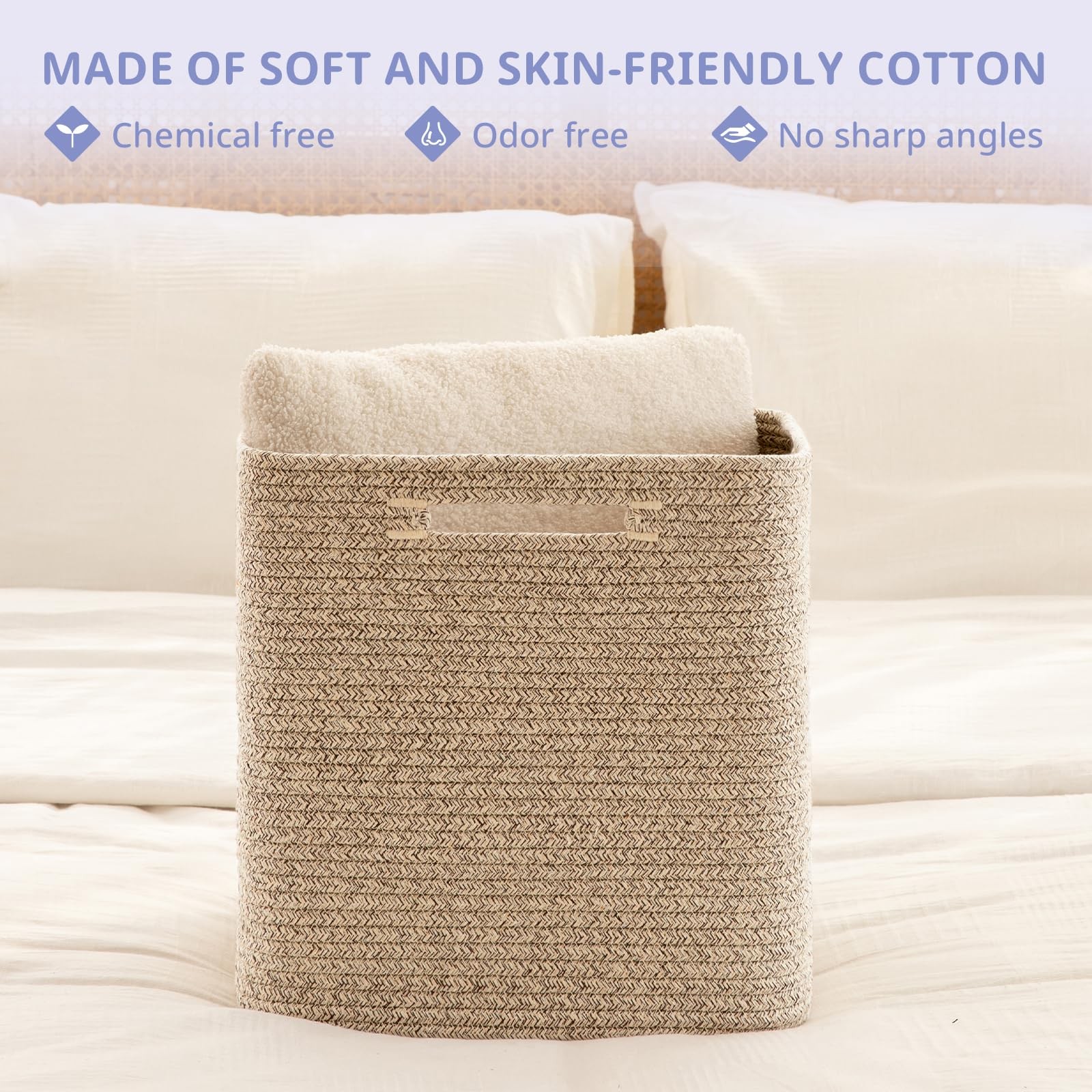 Storage Baskets We want to design storage organizer that fits all the rooms to meet your storage needs. Some storage space is designed for small objects, such as drawers and desktop organizers. Big objects also have storage needs, like baby’s clothes, blankets, toys, dirty clothes etc. Cube storage organizer bins are designed expressly for them. The organizer bins is very soft and lightweight but strong enough to stand up by itself even when it is empty. This small storage bins can also keep your every room tidy and clean. Specifications a bout the storage baskets: Material: 100% cotton Color: Grey/Brown /White/Black Size: 13’’x13’’x13’’ Notifications: The cube storage will be folded for shipping purposes, please fill it with the towels or clothes, it will back to the original shape in short time. Multiple purpose: Living room: rope woven cube organizer can be used to store the magazines, keys, glasses, snacks and so on. Organized your living room and keep the floor and sofa tidy. Baby room: Our clothing storage can work as a nursery basket in baby’s room. The toy organizers and storage can store babay’s toys, clothes, blankets, diapers, and so on. Laundry room: Can be used to store toilet paper, towels, skin care products, shampoo, conditioner, etc. Please don’t hesitate anymore, add it to your cart and purchase it right now! 100% Cotton Rope Woven Storage Bins:soft woven storage cubes are made of high-quality natural cotton, chemical free and safe for kids and pets. It will not scratch your furniture and floor, firm and easy to carry 2 Pack 13*13 Inch Storage Basket: These cube storage organizers will fit perfectly in cube cabinets and most cabinets and blend in with your room decor. Meanwhile storage organizer bins offer you a larger storage space than round storage bins of the same size Multi-Purpose Storage Organizer Bins: The cube storage bins can be easily hidden in closets, cabinets, side tables, cabinets, shelves, etc, without occupying any gaps. You can also use the organization basket as a nursery child room toy box, closet storage bins, towel baskets, book storage bins, magazine organizer cube, clothes basket, and many other purposes Storage Baskets for Shelves With Reinforced Handle Design - Each storage boxes are Crafted by skilled sewing workers, and the stitching is more even and more sturdy. You no longer have to worry about the product tearing or the handle breaking due to storing heavy objects since we made additional reinforcements for the handle NOTE: Our collapsible storage bins are handmade from flexible materials, which may result in slightly different sizes. Please fully unfold each side of the basket and measure from the center of each side to the center of the other side. Due to materials and folding, measuring along only one side or when folded may result in smaller measurements