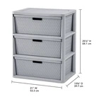 Sterilite Adult Plastic Wide 3 Drawer Cross-Weave Tower Cement: Outside Dimensions: 15 5/8" x 21" x 25 1/4" Single unit option Cement Interior Dimensions at bottom: 18" x 13 3/4" x 7" Timeless and stylish cross-weave pattern in a multi-purpose and versatile storage option for any room in the home Each drawer can become a portable bin by simply removing from frame The integrated carry-through handles allow the bin to be carried with ease Opaque drawers keep contents concealed and clutter controlled Designed with a drawer stop so the drawer will not unintentionally fall out Assembles easily in minutes, without the use of tools BPA-free and phthalate-free On Nov 21, 2024 at 02:27:55 PST, seller added the following information:
