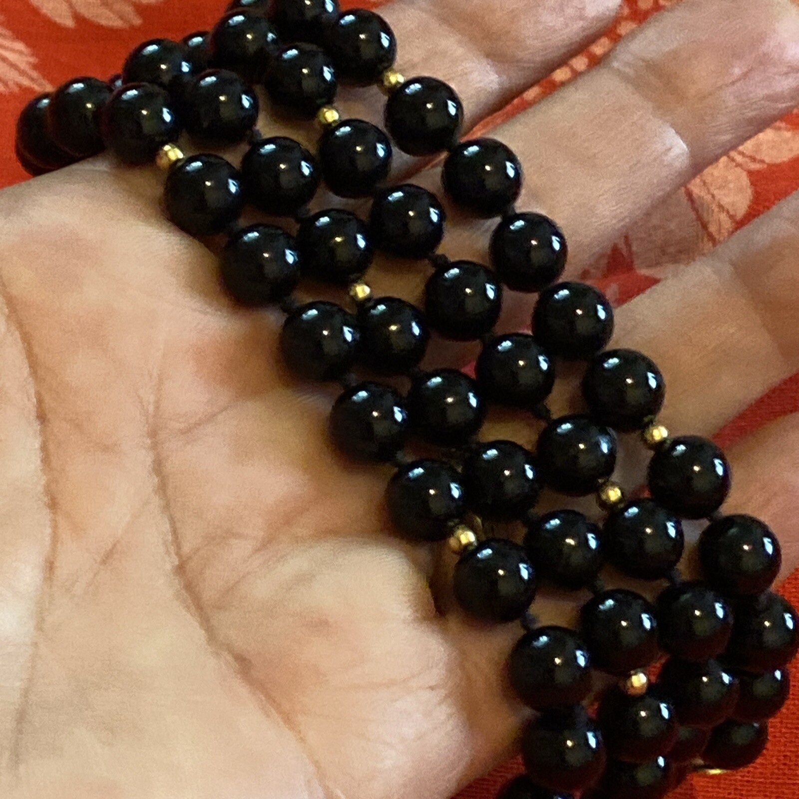 12” drop (24 total ) 30 perfect genuine Onyx stone beads hand knotted with black silk cord. Gold plated clasp and small accent beads (12) Great condition