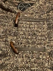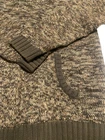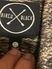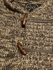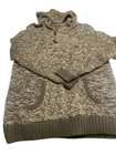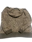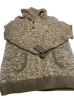 This hooded sweater is a heathered brown pullover with toggle buttons and a front pocket. It features a marbled pattern and long sleeves, making it perfect for casual wear in the fall and winter. The cotton blend fabric is knit cotton and acrylic , and the sweater is machine washable. The size is regular, fitting a women's size L. Brand is Birch Black