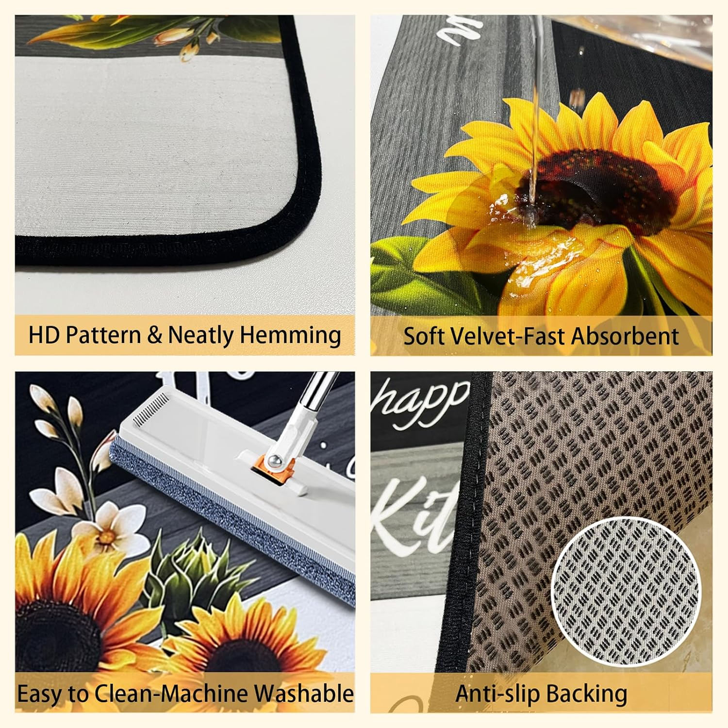 Store New Arrivals Add to Favorite View Feedback Contact Sunflower Kitchen Rugs,Non Skid Washable Microfiber Mats for Kitchen Floor, Black White Kitchen Cushioned Runner Rug Decor Sets of 2,Size 17"X 47"+17"X 30" Description Item model number -1 Style Modern Weave Type Tufted Pattern Sunflower Is Stain Resistant Yes Theme Runner,Sunflower Number of Pieces 2 Room Type Kitchen Material Polyester Model Name -1 Rug Form Type Runner Manufacturer -1 Item Thickness 0.3 Inches Indoor/Outdoor Usage Indoor Item Weight 2.09 Pounds Pile Height Low Pile Construction Type Machine Made Material Feature Soft, durable, non-slip Special Feature Washable、non-slip、durable、washable、stain-resistant Color Sunflower Shape Rectangular Back Material Type Rubber Recommended Uses For Product Kitchen floor decoration, providing a non-slip, absorbent surface in the kitchen Product Dimensions 47"L x 17"W Product Care Instructions hand wash or machine wash Size 17"x47"+17"x30" PERFECT SIZE: The sunflower Kitchen rugs set includes 2 mats (17"x30" and 17"x47"), black and white.Voanos kitchen mats set is available in multiple colors and patterns, so you can choose the one that best matches your kitchen decor. HIGH-QUALITY MATERIALS: Our kitchen mats are non-skid, washable, and made from Microfiber material. The 0.3" thickness and crystal velvet material provide cushioned support to reduce fatigue and discomfort while standing in the kitchen. NON-SLIP & DURABLE: The kitchen rug set comes with a non-slip backing, making it durable and ensuring it stays in place, preventing accidents while cooking. Note: Please keep the bottom of the kitchen rug and the ground dry when using, as water may cause slipping. FAST-ABSORBING & EASY TO CARE FOR: The surface of the kitchen rugs is designed to quickly soak up spills and messes, keeping your kitchen floors clean and dry. The kitchen mat usually only needs to be cleaned with a damp cloth, and when a deep cleaning is needed, simply toss it in the washing machine and tumble dry on low heat for hassle-free cleaning. MULTI-USE: Perfect for home kitchen floor decoration, suitable for wooden floors, marble floors, ceramic floors, and concrete floors, etc. Two sizes can be freely assembled in any area, such as the kitchen, bedroom, bathroom, standing desk, office, laundry room, sink, and stove. Product description Why choose Voanos kitchen rugs? HD Printed Patterns super absorbent Neat and strong binding Soft crystal velvet material Non-slip durable backing A big part of the overall happiness of the family comes from a good kitchen experience, no one likes a bad cooking experience, I believe we are the best choice for you! Keep the floor and kitchen mat backing dry before using! You can shake or brush your kitchen rugs, but you'll need to vacuum or machine wash them when they're heavily stained! Perfect for use on any floor type! You can use the Voanos kitchen mat on any floor material, as long as it stays dry, it will work! Two pieces of different sizes can also match any scene! ABOUT US We offer the best prices around on high quality products. Our E-store includes media such as books, movies, music and games while offering electronics, toys, sporting apparel, clothing, tools, general home, garden items and more. SHIPPING We are always working hard to ensure your package arrives as soon as possible. Please understand that some factors like weather, high postal traffic, and the performance of shipping companies are outside of our control. We offer free shipping to the lower 48 states and ship within 2 business days of payment, usually sooner. We do not accept P.O. Boxes. Please provide a physical address. For shipping outside of the continental USA, we only use eBay's Global Shipping Program.The item is shipped to KY and then sent to the rest of the world. International customers are responsible for all duties and taxes. Continue to check out in order to calculate costs for shipping the item to your country. Messages regarding eBay's Global Shipping Program MUST be directed at eBay EXCLUSIVELY. RETURNS We offer a 30-Day Return Policy on items which you are not completely satisfied with. You have the option for a full-refund or an exchange of the item. No returns are available on items shipped outside of the USA. PAYMENT We accept PayPal. CONTACT US This page content is yet to come Please ad us to your favorite seller and visit again later Thank You CUSTOMER SATISFACTION We try our very best to make sure every customer is completely satisfied. If there's a problem, message us! We're happy to help. WE ACCEPT Copyright © 2021 AutoDS. | All Rights Reserved