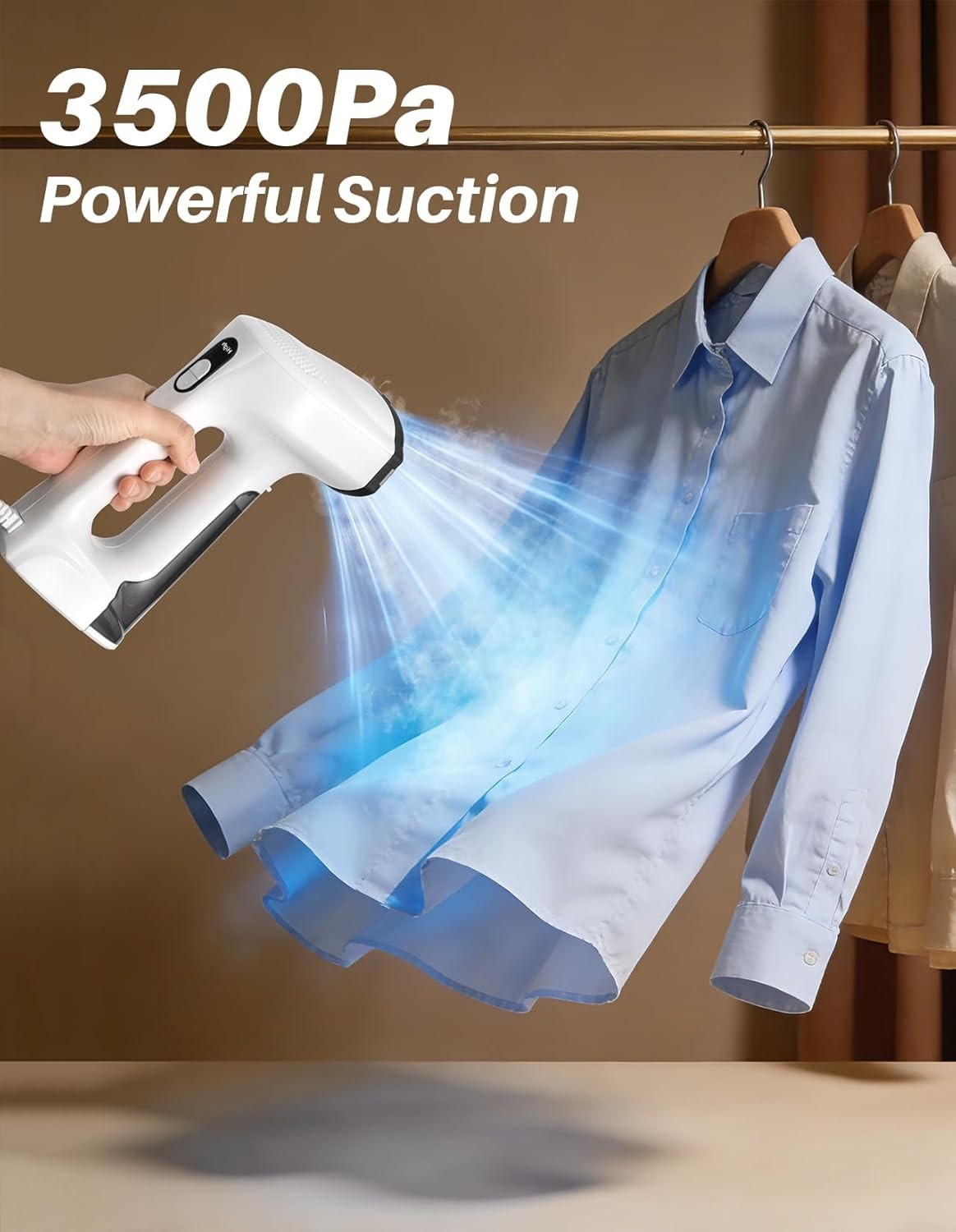 About this item Effortless One-Handed Steaming with Auto-Attach Suction: Forget wrestling with stubborn fabrics and the need for an ironing board. With 3500Pa of powerful suction, our vacuum steamer for clothes automatically grips onto any hanging garment. This innovative hands-free system lets you smoothly glide with one hand, even over tricky seams and edges. It's the ultimate safety and convenience, virtually eliminating the risk of burns and making delicate items a breeze to handle. Wrinkle-Blasting Power in Just 30 Seconds: Rushing out the door? No problem. Our 1200W heating system delivers a powerful burst of steam in half a minute. This intense steam penetrates deep into fabric fibers, rapidly relaxing and erasing even the most set-in wrinkles from last season's storage. Achieve a crisp, freshly-pressed look in record time with this powerful vacuum steamer for clothes, turning a chore into a quick, satisfying task. Master Every Fabric with 3 Intelligent Modes: Take the guesswork out of garment care. The clear LED display puts you in command with three specialized settings: Dry Iron for sharp creases and shaping collars without moisture, Low Steam for delicate silks and synthetics, and High Steam for heavy-duty fabrics like denim and linen. This garment steamer is your all-in-one tool for everything in your closet, ensuring perfect results every time. High-Capacity Tank for Uninterrupted Sessions: Tackle your entire wardrobe without stopping. The generous 160ml transparent tank provides up to 16 minutes of continuous steam, enough to refresh 5-6 garments in one go. The easy-fill, detachable design lets you monitor water levels at a glance and refill in seconds, ensuring a seamless and highly efficient steaming experience from start to finish with this high-performance handheld clothes steamer. Ready-to-Wear in Minutes, Zero Watermarks: Say goodbye to unsightly water spots and waiting for clothes to dry. Our ultra-fine steam technology and powerful vacuum steamer suction work in tandem to instantly evaporate moisture, leaving fabrics perfectly dry and ready to wear immediately. Enjoy flawless, professional-looking garments without any of the mess or delay of traditional clothes steamers or irons. Precise Smart-Temp for Delicate Fabrics: Protect your favorite investments. The advanced ceramic-coated plate and intelligent thermostat automatically adjust the temperature to be perfectly safe for any fabric—from delicate lace and silk to sturdy wool and cotton. It’s engineered to release steam only when fully heated, preventing any risk of hot water spatter or heat damage on all your garments, offering complete peace of mind with this reliable steamer for clothes. Compact & Travel-Ready with Freestanding Base: Your perfect steam is always within reach. Weighing just 2 lbs with an ultra-compact design, this travel steamer for clothes stores effortlessly at home and packs perfectly for trips. The freestanding base lets you safely set it down anywhere, freeing your hands instantly to answer calls or adjust garments. Complete with a storage bag and a 7.9-foot power cord for maximum flexibility. Product description Previous page Next page Previous page Next page Click to play video Previous page Next page Previous page