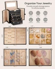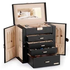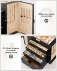 Jewelry and Watch Box: With 4 removable pillows in the top layer, you can store not only your jewelry but also your watches. ELEGANT: Attractive appearance with black faux leather surface and soft velvet lining. Over Dimension: 10.43’’ (L) X 6.10’’ (W) X 11.14’’ (H), large enough to hold your watches, necklaces, earrings, bracelets, hairpins, brooches and other jewelry. 4 Pull Out Drawers, includes a deeper bottom drawer and 3 equal size drawers. Drawer 1 has 4 earring cards and a ring roll. Drawer 2 has 12 equal size compartments. Drawer 3 has 4 equal size compartments. The deeper bottom drawer has only one compartment to store large jewelries. Each drawer is equipped with a delicate handle which can be opened easily. Swing Out Cabinets, each with 8 necklace hooks and 2 storage ledges, help to keep your necklaces from getting tangled. Perfect gift: The lid has a ribbon attached to keep it from falling back, mirror makes it easier to dress yourself, lock with a key adds elegance and security. Ideal gift for Valentine's Day, Mother’s Day, Thanksgiving Day, Christmas, birthday and wedding. Watch and Jewelry are not included.