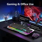 RGB Rainbow Backlit Keyboard: The keyboard mouse combo is through rainbow backlit keyboard and RGB breathable backlit mouse, you can customize the keyboard backlight/brightness/speed. The glitter keyboard offers 3 illumination modes and 3 brightness levels to choose from. FN+PgUp/PgDn: Backlight brightness and speed adjustment; Fn+1: Adjust the backlight mode (Constant Light/Breathing/Heartbeat), can be turned off if not needed Metal Panel Keyboard & Ergonomic Design: This computer keyboard and mouse combo boasts an aluminum alloy brushed panel, ensuring durability and ruggedness. Engineered with ergonomic precision, the gaming keyboard and mouse offer a comfortable 7° angle, preventing hand fatigue. With a 2.0mm keystroke, they deliver lightning-fast trigger response and rebound speed, providing an unparalleled typing experience Holder & Floating Keycaps: Featuring a practical and pen bracket, this membrane gaming keyboard ensures you have a convenient spot for your or pen during gaming or work. With keycap puller, you can effortlessly replace floating keycaps for easy cleaning. Plug and play, no setup, without the need for extra software or firmware Multimedia Keys & Anti-Ghosting: Featuring 12 multimedia combination keys at the top of the keyboard and a mouse with 4 adjustable DPI settings (1200-2400-4800-7200), this backlit wired keyboard and mouse set ensures seamless operation with 26 keys simultaneously. Experience lightning-fast response times during gaming and work tasks. In addition, with a lock/unlock WIN key to avoid accidental touches during gameplay, your gaming experience will be smoother than ever Wide Compatibility: USB mouse and keyboard combo set is designed to work with a wide array of devices. It automatically enters sleep mode after 5 minutes of inactivity, and any key press will wake it up. Compatible with Windows 2000/2003/XP/Vista/Win 7/8/10/Mac/iOS for gaming, it also supports PC, laptop, Google TV, and smart TV. Additionally, it functions seamlessly with PS4/Xbox After-Sales Protection: If you encounter any problems with lighted Keyboard, such as malfunctioning keys or fading keycaps, please reach out to our professional team and we will reply within 24 hours and give you the satisfactory solution