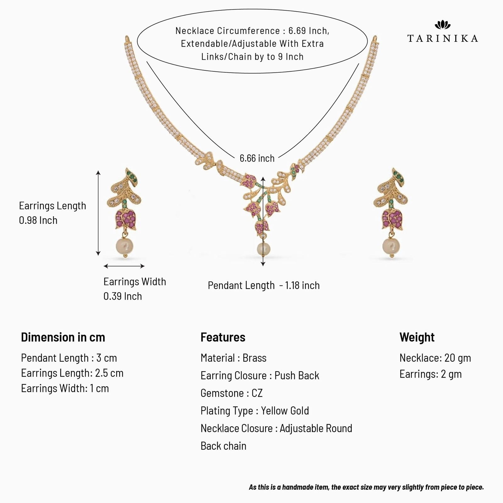 TARINIKA Jivisha Necklace Set with Earring for Women Wedding Bridal Jewelry set with Cubic Zirconia Stone and Pearl, Gold Plated Brass Jewelry for Brides/Bridesmaids/Party/Gift for her Product Details Color: White Red Green Brand: TARINIKA MPN: ZNX0851XC UPC: Does not apply EAN: Does not apply Department ‏ : ‎ womens Date First Available ‏ : ‎ May 16, 2023 Brand, Seller, or Collection Name: TARINIKA Material: Gold-Plated Brass Gem Type: Cubic Zirconia Chain: Cable Clasp: Hook Clasp Metal: Gold Plated Brass Metal stamp: 8k (333) Number of stones: 10 Stone Creation Method: Synthetic Stone Treatment Method: Filled