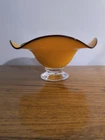 Add a splash of vintage charm to your home decor with this stunning TELEFLORA Ruffled Tango Art Glass Pedestal Bowl. The vibrant orange color of the bowl will add a pop of color to any table setting. Crafted from high-quality glass, this bowl is perfect for serving fruits, salads, or snacks. Item has been housed in a glass cabinet since purchase. The intricate ruffled design of the bowl is a beautiful addition to its vintage charm. This bowl is perfect for those who appreciate the unique and beautiful things in life. It is a great addition to any collection or as a standalone piece.