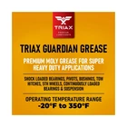 TRIAX Guardian Heavy Duty Grease with Moly, True Multi Purpose, Wheel Bearings, Shock Loaded Components, Extremely Tacky, Zero Separation (10 Pack - 14 Ounce Tubes) Description Features: ULTRA PERFORMANCE HEAVY-DUTY GREASE: EP wheel bearing grease with Molybdenum; exceptional mechanical stability and adhesion in high-pressure areas ULTRA TACKY IN SEVERE SERVICE: Remains in place -400 F dropping point; contains corrosion and rust inhibitors to protect all metals VIRTUALLY WATERPROOF: Exceptional resistance to water and washout; ideal for working in wet, high moisture environments NO SEPARATION: Virtually zero separation in severe service, high shear, high loads, and shock loading (oil will not run out of the grease) WHEEL BEARING APPLICATIONS: Unlike traditional red greases, TRIAX Guardian works well in all types of heavy-duty wheel bearings including shock loaded and continuously loaded bearings OUTSTANDING PERFORMANCE for heavily loaded components including: journal bearings, pivots, bolts, tractor trailer fifth wheels, heavily loaded wheel bearings, and shock loaded components Product Details: Material: Lithium,Metals Brand: Triax Package Information: Tube Liquid Volume: 14 Fluid Ounces Item Weight: 8.26 Pounds Material: Lithium,Metals Brand: Triax Package Information: Tube Liquid Volume: 14 Fluid Ounces Item Weight: 8.26 Pounds Recommended Uses For Product: Construction,Mechanical Viscosity: NLGI-2 Specific Uses For Product: Construction,Mechanical Item Form: Grease Manufacturer: TRIAX Unit Count: 140.0 Ounce UPC: 850023978301 Number of Items: 1 Item Weight: 8.26 pounds Product Dimensions: 8 x 12 x 5 inches Item model number: 10 Is Discontinued By Manufacturer: No Manufacturer Part Number: TRX9751 Date First Available: September 8, 2017 Delivery We Do Not Ship Outside of the Continental US. Return Policy All items qualify for returns within 30 days of receipt. Buyer is responsible for return shipping on any item that is not damaged. Feedback We take our reputation seriously, we buy and sell online, so we understand the value of trust. If you are unsatisfied with your order, please contact us and we will work with you to resolve it to your satisfaction.