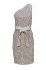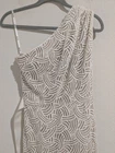 Tadashi Shoji White Cream Embroidered One-Shoulder Belted Tie-Waist Sheath Dress Elegant Classy Evening. Great pre-owned condition overall, aside from minor flaws. Size 2. Has some stretch. Fully lined. Soft embroidery. Soft and smooth interior. Polyester lining. Belt is sewn in. *Faint stain at front hem - not easy to notice due to the detailing of the dress. *Very faint stain on back hem, left side of seam. *Faint discoloring at both armpits. Length: 37" Pit to pit: 15" Waist: 12"