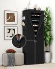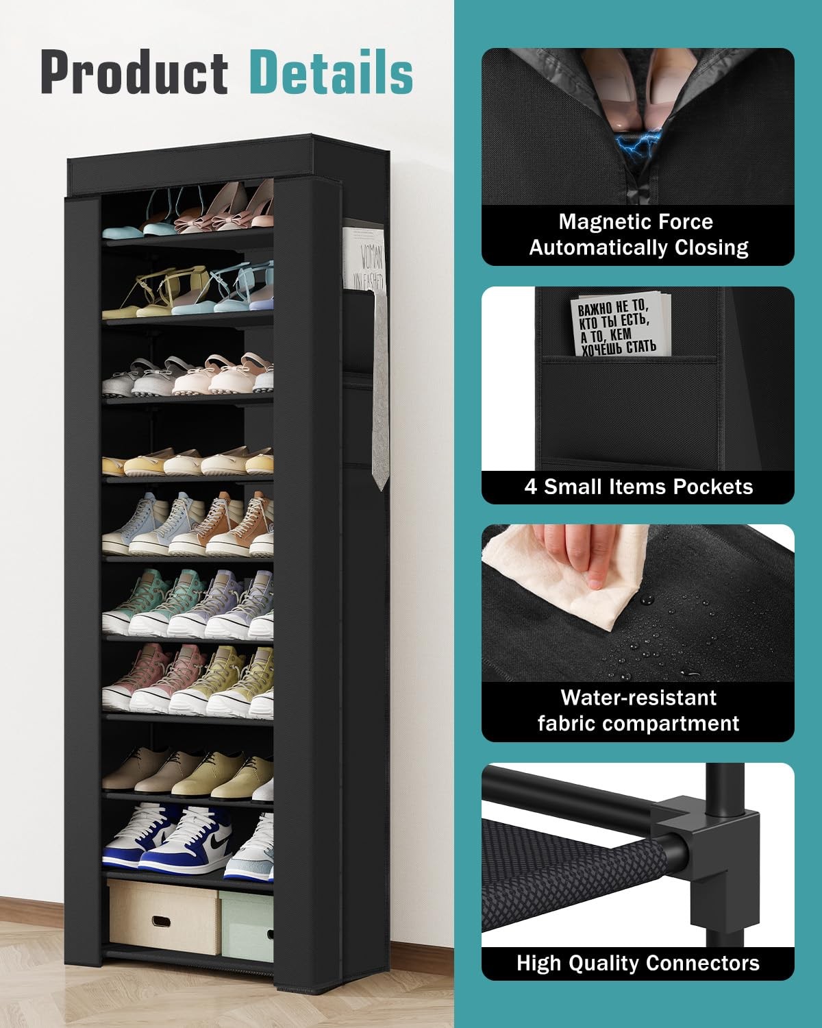 Material: Metal, Plastic, Non-Woven Size: 24" L × 11" W × 68.9" H Color: Black Imagine walking into your home after a long day—no more tripping over scattered shoes or digging through cluttered corners. Right by the front door entrance stands your tall shoe rack with cover, its sleek black frame blending into your entryway like it’s always been part of your home. You flip open the magnetic closure—no noise, no tugging, no awkward bending—and your shoes are right there, organized and dust-free inside your shoe storage cabinet. This isn't just a shoe rack—it's your personal shoe cabinet, with 10 spacious tiers to neatly store sneakers, heels, boots, and kids’ shoes. Whether you need a shoe organizer for closet, a shoe rack for dorm, or a shoe rack for entryway, adapts to your space and lifestyle. Two side pockets function as a mini purse organizer—perfect for keys, gloves, or dog leashes. Need flexibility? This shoe organizer transforms easily—split it into two 5-tier units, or remove shelves to store taller items like bags or boots. Whether you're using it as a shoe rack for closet organization or as a shoe rack for front door entrance, this smart storage solution fits in. Designed for durability and simplicity, this shoe rack organizer assembles quickly and holds up strong in the bedroom, garage, or even walk-in closets. Ideal for small spaces, growing families, or anyone tired of shoe chaos—this is more than just a shoe organizer for closet, it’s your daily decluttering partner. Take back control of your space with . 【Magnetic Closure Design】 Our upgraded shoe rack with cover features a magnetic front flap that opens effortlessly—no rolling, no hook-and-loop fasteners, and no bending down. Unlike traditional zipper covers, this dustproof shoe organizer for closet lets you open and close it in just 5 seconds. Enjoy easy, stand-up access to your shoes while keeping them clean and organized in this narrow shoe rack for entryway, closet, or dorm room 【Large Capacity Shoe Organizer】 Measuring 24" L × 11" W × 68.9" H, this shoe rack for closet offers 10 spacious tiers that hold 2–3 pairs of shoes per layer—perfect for sneakers, heels, flats, or ankle boots. Ideal as a closet shoe organizer or entryway shoe storage cabinet, it keeps your footwear neatly arranged and easily accessible. Two side pockets provide extra space for socks, shoe brushes, or small accessories, making it a space-saving shoe rack organizer for any room 【Durable Materials】 This sturdy metal shoe cabinet features a coated black iron frame with reinforced plastic connectors for long-lasting use. The thick non-woven fabric cover keeps dust out, ensuring your shoes stay clean and tidy. Inside, each tier is lined with a waterproof fabric layer that resists spills and dirt—making it easy to wipe clean and maintain a neat storage space. Ideal for use in the garage, closet, bedroom, or entryway 【Adjustable & Stackable Design】 Designed as a stackable shoe rack for entryway, this unit includes 10 tiers that can be separated into two 5-tier racks. Each tier is approximately 6.7 inches tall—suitable for most shoes. Easily remove shelves to fit boots, bins, or large items, making it a versatile shoe rack for dorms, small closets, or apartments. 【Easy to Assemble】 Although this tall shoe rack includes multiple components for a sturdy build, the assembly is simple. Each piece is clearly categorized, and detailed instructions are included—plus, you can follow our step-by-step assembly video for an even easier setup. Whether you’re setting it up as a shoe rack for front door entrance, dorm, or rental, it’s a renter-friendly solution. If you need help, our support team is always ready to assist 【Multi-Use Shoe Cabinet】 This lightweight and portable shoe rack organizer fits perfectly in bedrooms, garages, balconies, or near the front door entrance. Besides shoes, the tiers can store folded clothes, bags, books, or seasonal decor. Use it as a functional free standing shoe rack or general-purpose rack to keep your space organized