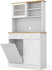 Product Description About this item Multifunctional Hutch Cabinet: 68” tall buffet cabinet combines the functions of closet, bar, T tilting garbage cabinet, storage cabinet and so on. Can be used as hutch cabinet, kitchen island, buffet sideboard, coffee bar cabinet, laundry basket. Large & Sorted Storage Space: Featuring storage hutch, 2 drawers and bottom cabinet, the pantry cabinet provides versatile storage options for your kitchen supplies. Plus, wide rubber wood countertop with cable management hole is a convenient spot to keep appliances with reach. Hidden Garbage Holder: This kitchen hutch cabinet features a hidden 10-gallon holder to conceal the waste’s unpleasant odors and prevent pets from digging up trash. Can not only this tilt out trash bin cabinet serve to be a waste bin in the kitchen, but also be used as a laundry basket in the laundry room, a recycle bin, a pet food bin in the living room. Note: Trash Bin is not included. Use with Convenience: The 3-position adjustable shelves in the food cabinet can maximize the storage capacity of upper and bottom cabinets, ensuring efficient utilization of space. In addition, the sliding tempered glass cabinet allows for more storage convenience. Plus, provides cable management holes for organizing cords. High Reliable Structure: Thickened board with tight connection casts a firmly constructed kitchen cupboard. When set against the wall, the kitchen hutch with trash can storage hold in place with anti-tip devices to prevent rocking or tipping. Description: Say goodbye to a messy and smelly kitchen! This kitchen pantry cabinet features a hidden 10-gallon garbage holder, allowing you to conveniently dispose of waste while keeping it out of sight. With a spacious countertop and drawers, you will get ample storage space for essentials. The adjustable shelves provide flexibility to accommodate your storage needs for various items. Besides, the sliding tempered glass cabinet not only adds display options but also protects your belongings. Meanwhile, specially designed with anti-toppling device, the floor trash cabinet is stable enough to hold kitchen utensils without wobbling.This modern tall kitchen cupboard can be used as recycling cabinet, pet food storage cabinet and laundry sorted cabinet, providing versatility and convenience. Features: 10 gallon trash cabinet can keep pets away from waste and hide smell Rubber wood countertop is sturdy and durable for a long life span Storage cabinets with 3-position adjustable shelves fit different sized items Sliding tempered glass cabinet for easy access 2 drawers provide ample classified space for kitchen supplies Secure the trash can cabinet with anti-toppling device for higher stability Cable hole keep the messy wires hidden at the back Equipped with sturdy metal hinge for 30°max opening angle Smooth metal slides make it convenient to push in and pull out Widely use as a trash cabinet, laundry sorter or recycle bin Specifications: Color: White + Natural Material: MDF, Rubber Wood, Tempered Glass Overall Dimensions: 39.5" x 13.5" x 68" (L x W x H) Upper Storage Cabinet Interior Dimensions (Each): 17.5" x 6.5" x 7.5" (L x W x H) Countertop Dimensions: 39.5" x 12.5" x 16" (L x W x H) Left Side Cabinet Panel: 18" x 24.5" (L x H) Right Side Cabinet Upper Storage Compartment: 18" x 12.5" x 10" (L x W x H) Right Side Cabinet Lower Storage Compartment: 18" x 12.5" x 14" (L x W x H) Drawer Interior Dimensions: 15.5" x 11.5" x 3" (L x W x H) Weight Capacity in Total: 300 lbs Net Weight: 89 lbs Max Opening Angle: 30° Package Includes: 1 x Tilt Out Trash Cabinet 1 x Instruction On Aug 14, 2025 at 20:01:46 PDT, seller added the following information: