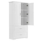 Tall White Bathroom Storage Cabinet with Doors & Drawers – Adjustable Shelf, MDF, Modern Freestanding Organizer free&fast shipping !!! Desctiption : Bring elegance and order to your space with this Tall White Storage Cabinet , crafted from durable painted MDF wood . Designed to suit bathrooms, kitchens, or even offices, this freestanding unit features two large drawers and a double-door cabinet with adjustable shelving —perfect for storing towels, toiletries, pantry items, or decorative pieces. ✅ Key Features: Sturdy & Elegant: Made of premium painted MDF with smooth, waterproof surfaces Spacious Design: Features 2 deep drawers and a 3-tier cabinet behind double doors Adjustable Shelf: Customize the internal layout to suit your needs Safe for Families: Includes an anti-toppling device for wall attachment Versatile Use: Ideal for bathroom, kitchen, laundry room, or living room Easy to Assemble: All tools and instructions included 📦 Product Specifications: Main Color: White Main Material: MDF (Medium-Density Fiberboard) Overall Dimensions: 32” L x 15” W x 63.2” H Drawer Inner Size: 31.3” W x 11.9” D x 7.1” H Shelf Weight Capacity: 45 lbs each Drawer Weight Capacity: 25 lbs each Net Weight: 72.75 lbs Assembly Required: Yes Certification: CARB P2 Compliant 📦 Package Includes: 1 × Tall Bathroom Cabinet 2 × Large Drawers (pre-cut panels) 2 × Cabinet Doors 3 × Interior Shelves (1 adjustable) 1 × Hardware Pack (screws, hinges, anti-tip kit) 1 × Step-by-Step Instruction Manual ✨ Whether you're upgrading a small bathroom or organizing a busy kitchen, this stylish and practical cabinet provides the perfect balance of beauty and functionality .
