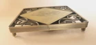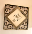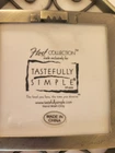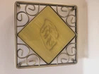 Tastefully Simple Host Collection trivet. Brass colored metal with ceramic green leaf square in center. Hanger for wall hanging. Measures 5" x 5" and 1/2" tall. Very nice condition.