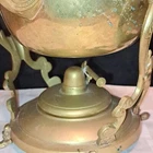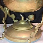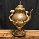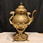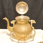 This antique brass teapot set is a beautiful addition to any collection. The set includes a large teapot 15 inches tall with handle, b 8 inches wide and 56ozs. with lid and a stand with an oil burner., featuring an elegant floral pattern etched into the brass. The teapot sits on a tilting stand with an oil burner, perfect for keeping your tea warm during long conversations. The set also includes five cups and features a Victorian style, with a two-tiered design and a single compartment. This original piece was manufactured in the early 1900s and is signed by the Faida Company. Ideal for all occasions, this teapot set is a true treasure for any tea enthusiast.