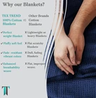 Tex Trend 100% Cotton Blankets King Size – Durable (U.S. Standard), Navy Product Details Material: Cotton Color: Navy Brand: Tex Trend Special Feature: Fade Resistant, Durable, Soft, Breathable Style: Modern Blanket Form: Throw Blanket Age Range (Description): Adult Product Dimensions: 108"L x 90"W Theme: Plain Pattern: Waffle Recommended Uses For Product: Travel, Napping Seasons: All Fill Material: Cotton Weave Type: Waffle Product Care Instructions: Machine Wash Size: King (U.S. Standard) Fabric Type: 100% Cotton Unit Count: 1.0 Count Number of Items: 1 Fabric Warmth Description: Lightweight Sport: Camping Water Resistance Level: Not Water Resistant Model Name: Waffle Manufacturer: Tex Trend Item Weight: 6.25 pounds Country of Origin: India Item model number: COTTON-BL-$P Soft, Breathable & Stylish: Crafted from 100% cotton, this pre-washed blanket boasts a soft and gentle texture that becomes even more luxurious with each wash. Its anti-static fabric ensures exceptional breathability and moisture absorption, providing a cozy and dry sleeping experience throughout the year. All Season Comfort: Imagine wrapping yourself in a blanket that feels like a warm embrace on a chilly night. Our classic weave is designed to provide exceptional comfort and warmth without feeling stuffy or suffocating. The open cell weave ensures proper air circulation, making it a versatile bedding essential for all seasons. Whether you're seeking a light layer in spring and summer or an additional layer in fall and winter, our blanket offers optimal comfort without feeling too heavy or too light. Waffle Weave Texture: The timeless waffle weave design combines classic elegance with a modern touch, featuring a three-dimensional, puffy appearance. The intricate craftsmanship adds a sophisticated flair, creating a serene atmosphere that complements any home decor. Additionally, the unique waffle weave promotes air circulation, enhancing the blanket's breathability. Warm Yet Lightweight: Crafted from premium long-staple cotton, this waffle blanket offers a harmonious blend of warmth and weight. Ideal for cuddling up, its soft and soothing fabric will envelop you in comfort and tranquility. Versatile Blanket: Beyond its traditional use as a bed or sofa blanket, our waffle blanket can be used as a bedspread or layered on your bed. It's also perfect for outdoor activities like picnics, travel, backpacking, or even napping in the office or car. To prevent snagging, we advise against allowing pets to play on the blanket.