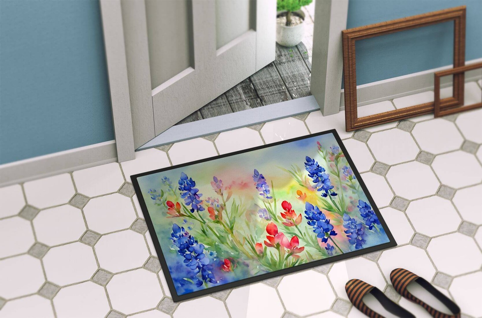 Highlights Versatile & Stylish: Ideal as an indoor or outdoor mat, this 18x27 inch Artwork Door Mat enhances any entryway, porch, or outdoor kitchen with its unique design. Add a touch of style and functionality to your space. Durable & Weather Resistant: Crafted with layers of polyester felt and rubber, and bound by sturdy black tape, this mat stands up to all weather conditions. Its rubber-stamped bottom prevents slipping, ensuring safety and stability. Easy to Clean: Maintenance is a breeze - simply rinse with a garden hose or use a power washer to eliminate dirt. No suds-producing cleaners necessary. Alternatively, vacuum on floor setting for indoor cleaning. Quality Production: Proudly made and printed in the USA by Caroline's Treasures, our mat ensures high-quality design and durability. Its vibrant, dyed polyester felt top layer stays bright and eye-catching through use. Great gifts: Great hostess gifts, a housewarmning gift for that new home or a wedding gift for that new couple. All of our products feature artwork from one of our artists or desingers. A great gift for your dog walker, groomer, or pet sitter. Texas Bluebonnets gifts,Texas Bluebonnets collectibles Specification Brand:Caroline's Treasures Details Doormat featuring breed specific Texas Bluebonnets artwork. Welcome your guests in style with our Artwork Door Mat, designed to withstand almost any weather condition. This mat, measuring approximately 18 by 27 inches, is held together by durable black binding tape. Its top layer, composed of polyester felt, is dyed with the eye-catching image you see on the mat. A few layers below provide the mat with stability, while its rubber bottom is stamped to help prevent slipping and ensures safety. Our mat works wonderfully as both an indoor or outdoor door mat. For cleaning, simply hose it off with water or use a power washer - no need for any cleaner that produces suds. Avoid scrubbing with a brush, instead, opt for the vacuum on floor setting. Designed manufactured and printed in the USA, this mat is a perfect addition to your porch, outdoor kitchen, entryway, or any indoor space. Its unique design makes it a charming decorative rug that greets your guests and adds a stylish touch to your home decor.