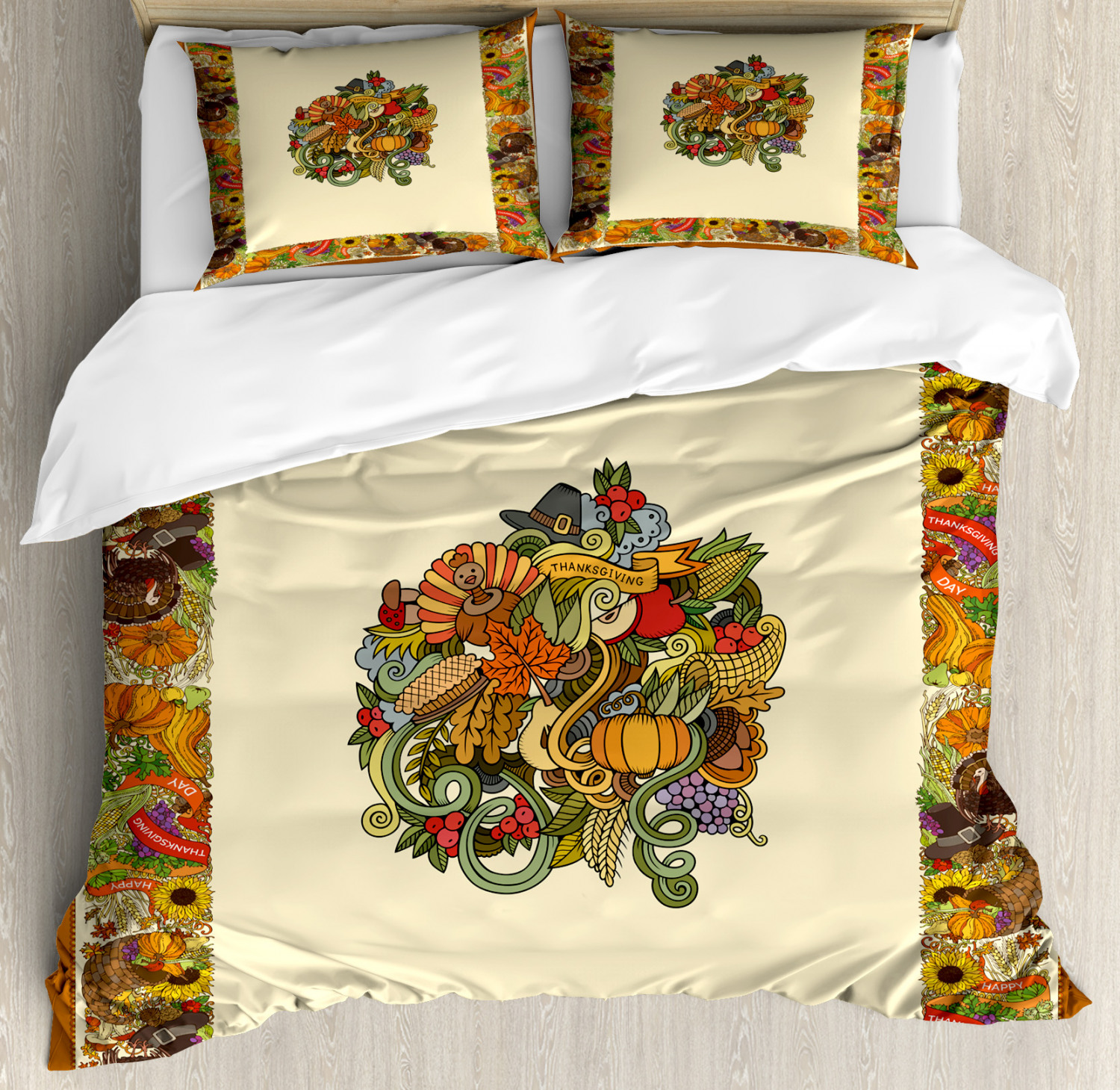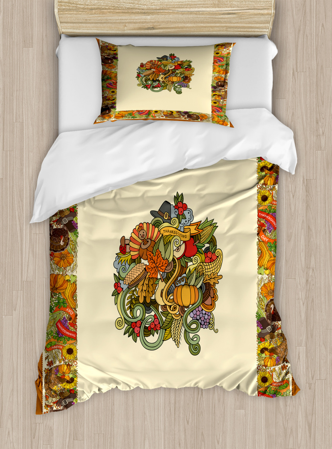 Thanksgiving Duvet Cover Set King Size Pumpkin Wreath Bow with 2 Pillow Shams Time to embrace modern looks, feel-good fabrics, and high-quality materials! King, queen, or twin - these 3 pcs duvet cover sets will work in any bed for any season! Woven from 100% brushed microfiber fabric, our duvet cover collection is constructed for maximum strength and ultra comfort only for you and your beloved ones. All you need to do is to simply put our duvet cover on your comforter and secure it with zipper closure, and enjoy your new bedding set! MEASUREMENTS: KING SIZE SET: Duvet Cover (104" W X 88" L) and 2 Pillow Shams (36" W X 20" L). QUEEN Size Set: Duvet Cover (88" W X 88" L) and 2 Pillow Shams (30" W X 20" L). Twin Size Set: 1 TWIN Duvet Cover 68" X 88" + 1 Pillow Sham 30" X 20". The duvet cover FEATURES hassle-free hidden zipper and the pillow shams have an envelope closure. Please note that COMFORTER NOT INCLUDED IN THIS SET. This only duvet cover, allowing you to protect the comforter/duvet insert from dust, mites, and other stains. WRINKLE FREE - The microfiber material creates ultimate softness and comfort, also provides wrinkle, fade, and shrink resistance when properly cared for. Very durable and sustainable material that will not endanger your health or the environment, either. No chemicals used, No dye substance harming the health of you or your family, %100 microfiber recyclable environmentally friendly fabric. LOW MAINTENANCE: Machine washable in cold water. Suitable for tumble dryer use on low heat. Can be ironed on medium heat when necessary. Do not bleach. Choose your style between thousands of different and creative patterns. Or simply find your perfect gift idea ever for housewarming, birthday, bridal shower, Christmas, Mother’s Day, and newlyweds… You can find a theme for everybody and every interest in our Ambesonne Store. The images we display have the most accurate color possible but, due to differences in pc monitors, there can be slight color differences between the product and the image. Due to manual measurement, please kindly allow 1-2 cm discrepancy. The Duvet Cover and Pillow Shams are printed on the FRONT SIDE ONLY, the back of them are PLAIN WHITE-COLORED. This is ONLY the Duvet Cover, sold WITHOUT the Comforter.